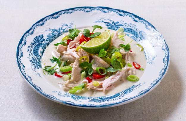 Skjær lime i båter, skjær vårløk og chili i tynne ringer og grovhakk koriander. Server suppen varm med chili, koriander, vårløk og limebåter.
