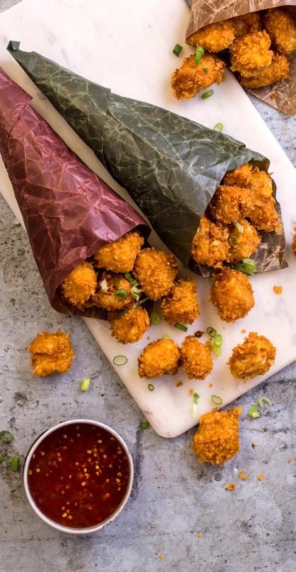 Friter bitene (eller stek i panne) til gylne og sprø, ca. 10 minutter. La renne av seg på litt kjøkkenpapir. Server popcorn-kylling med sursøt chilisaus.