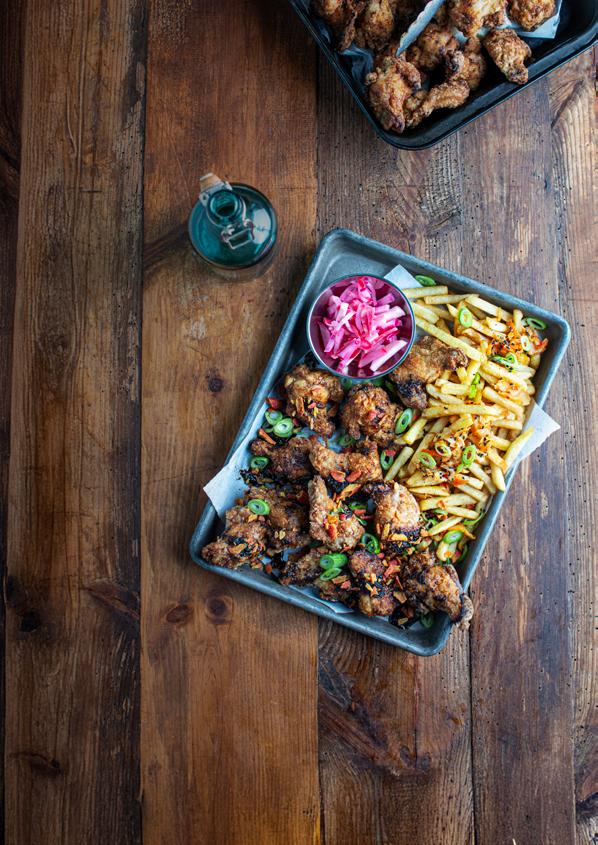 Legg crispy koreanske kyllingvingeklubber på fat med kimchitoppet fries, dryss over knuste Takis.