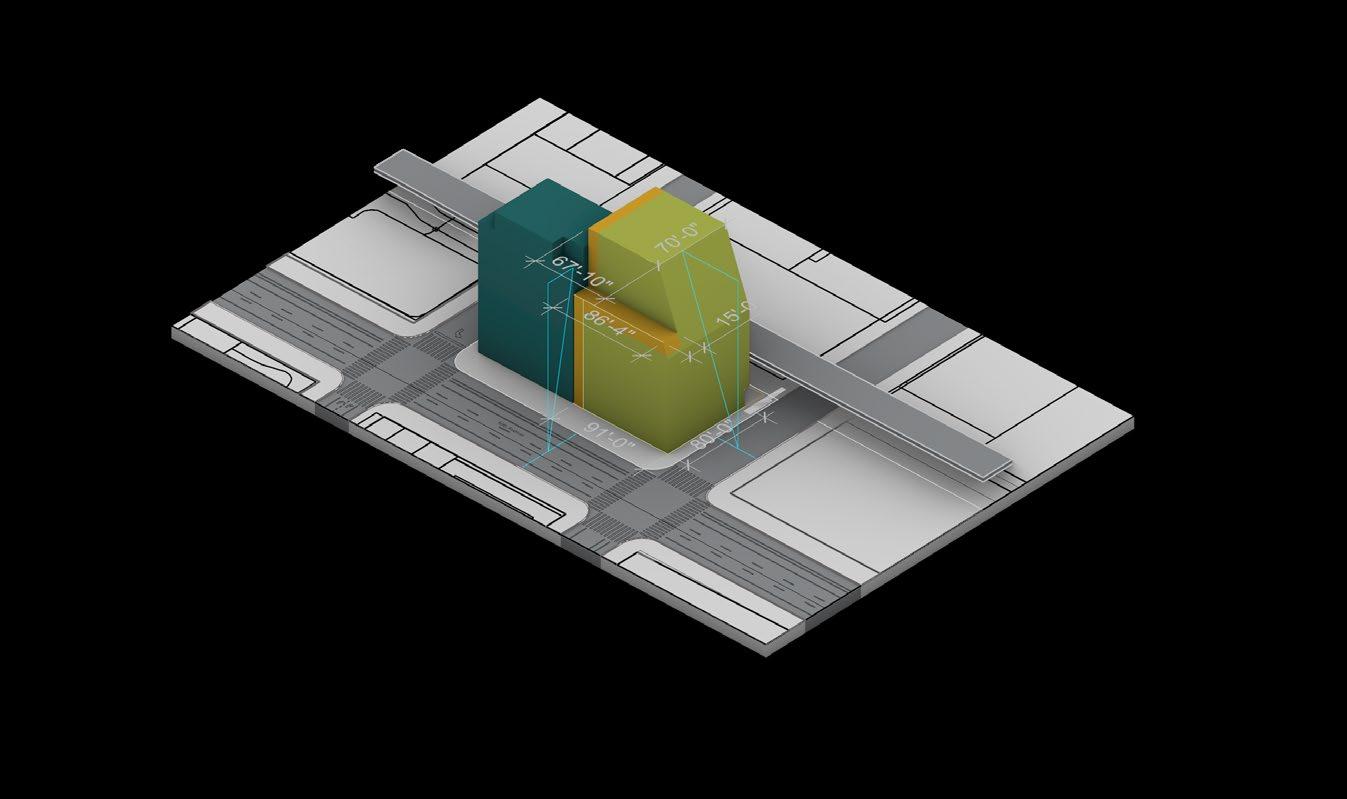 The process began with a plan-based analysis to establish the maximum buildable footprint on the site. By studying site boundaries, setbacks, and circulation patterns, I determined that the largest possible ground-level buildable area measured 91 feet by 80 feet. This defined the foundational spatial limit and provided a clear starting point for volumetric and conceptual development.