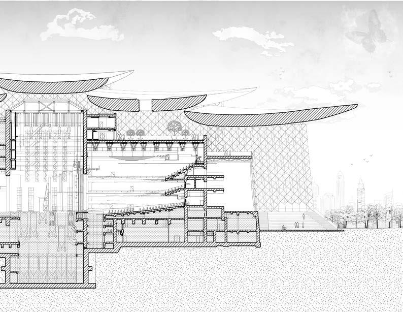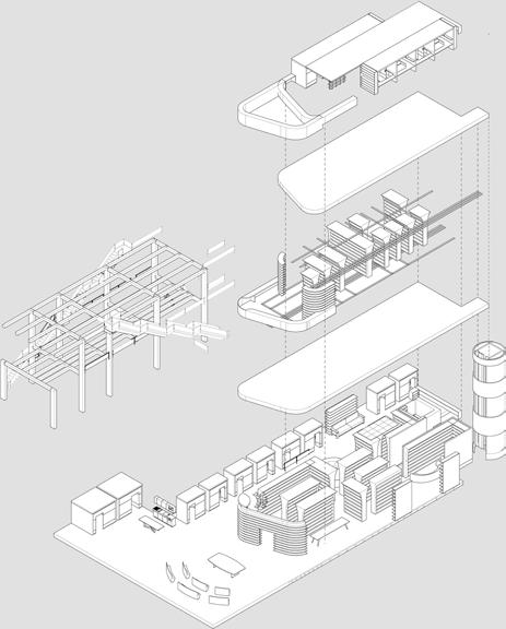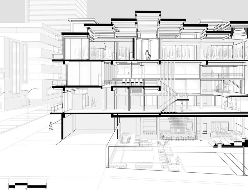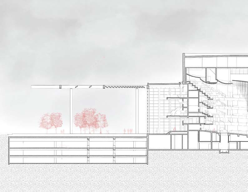 Each level peeling away like layers of an experience, from the social energy of the bar to the focused adaptability of the coworking spaces, culminating in the gallery’s playful exploration of movement. the section reveals a seamless transition between gathering, working, and discovering, shaping an architecture that is as dynamic as the people within it.