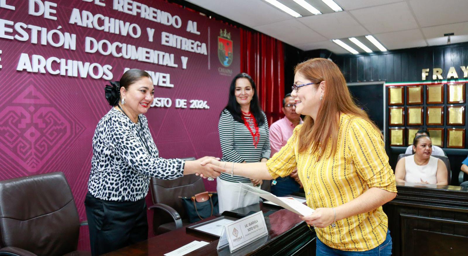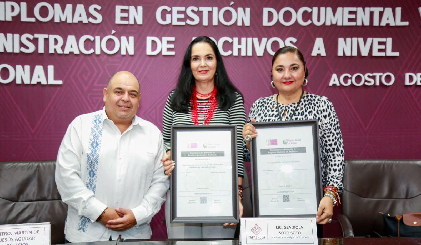 -El Ayuntamiento de Tapachula que preside la alcaldesa, Gladiola Soto Soto, recibió las constancias de refrendo al Registro Nacional de Archivos y diplomas en gestión documental y administración a nivel nacional, con lo que se da cumplimiento con la Ley General de Archivo y la Ley de Archivo del Estado de Chiapas.