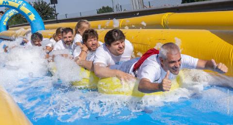 às ruas de S. Mamede de Infesta”, afirmou Leonardo Fernandes, Presidente da União de Freguesias de S. Mamede de Infesta e Senhora da Hora, destacando o papel do evento na promoção do convívio e da participação ativa dos cidadãos. O Water Slide Summer contou com duas imponentes pistas de escorregas, onde famílias e amigos puderam deslizar em boias coloridas, acompanhados de muitos risos e boa disposição. Para os mais pequenos, foi disponibilizada uma piscina infantil, além de insufláveis gigantes que garantiram horas de diversão. A oferta de entretenimento foi complementada por uma Fun Zone animada por DJ’s e animadores, além de uma zona de restauração diversificada, proporcionando