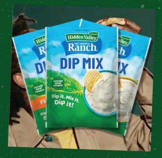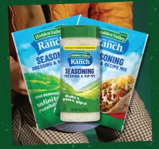 It’s time to shake up your snacks, dips and meals with zesty Ranch air! Whether you are looking for a salad seasoning mix or want to add a tangy touch to snacks or shake up your dinner menu with big, bold avors, our line of Hidden Valley™ Ranch Seasonings and Recipe Packets have you covered.