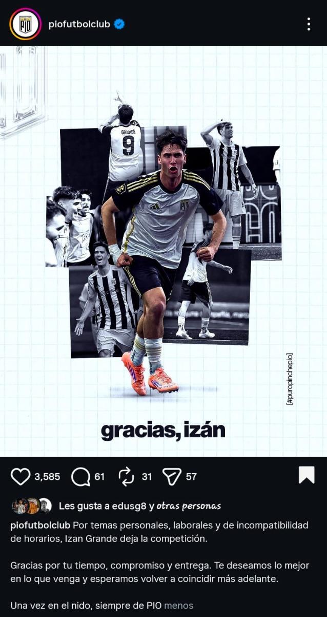 Izan Grande se va. Por horarios incompatbles, es lo que menciona el propio club al pie de imagen publicado en sus redes sociales.