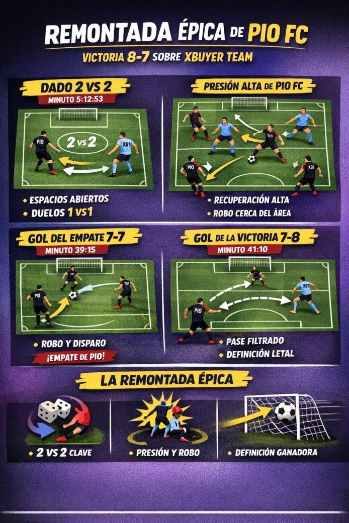 Hay partidos que se ganan con dominio. Y hay otros que se ganan cuando el partido deja de ser orden… y se vuelve instinto. La remontada de PIO FC frente a XBuyer Team nació así. No de un momento aislado, sino de una secuencia de grietas que comenzaron a abrirse lentamente, como si el partido fuera una pared que empezaba a resquebrajarse. Y cuando finalmente se rompió, PIO FC ya estaba listo para atravesarla.