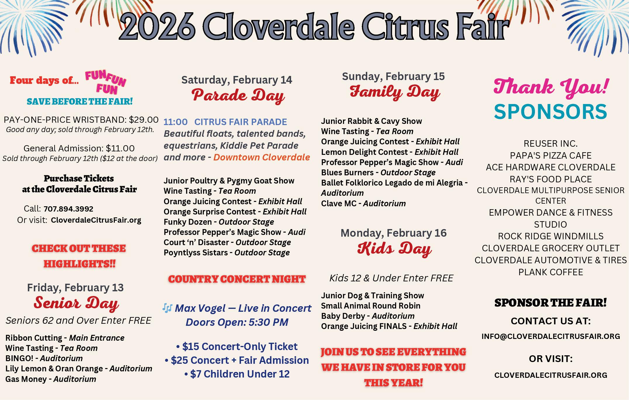 134th Annual Cloverdale Citrus Fair. A multi-day fair featuring carnival rides, live entertainment, food, and citrus exhibits for all ages. Starts at noon February 13–16. Cloverdale Citrus Fairgrounds. 1 Citrus Fair Dr., Cloverdale. cloverdalecitrusfair.org