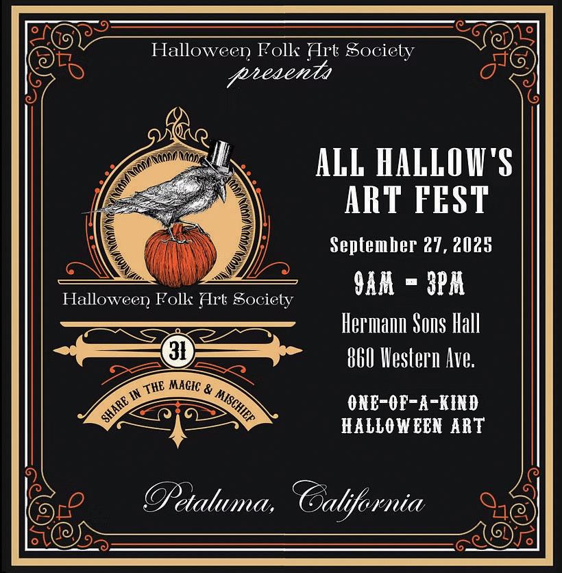All Hallow’s Art Fest. Halloween art, décor, jewelry, & collectibles. Admission: $5. Ages 12 & younger: free. 9 a.m.–3 p.m. Hermann Sons Hall. 860 Western Ave., Petaluma (enter on Webster Street). halloweenfolkartsociety.com.