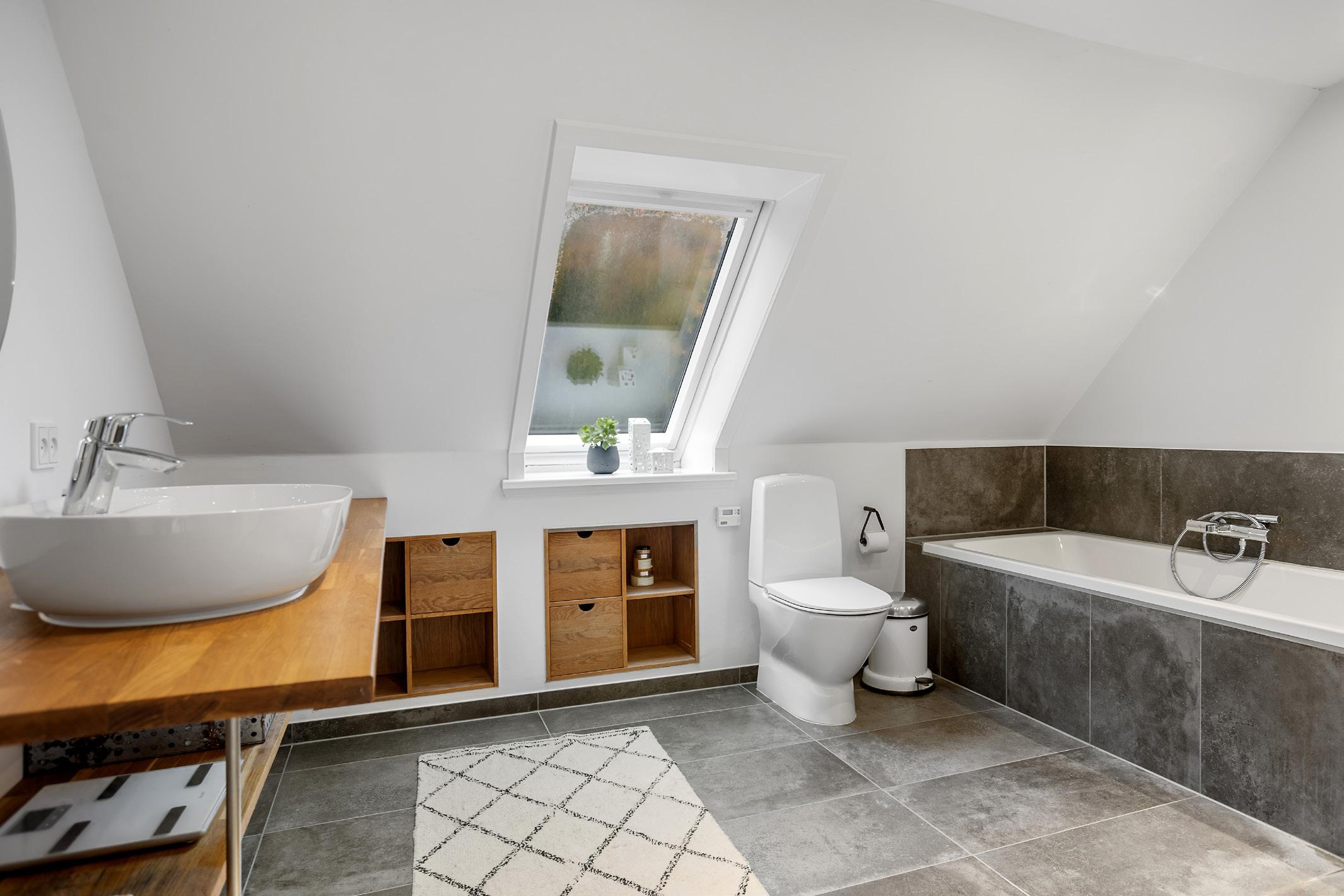 På førstesalen ligger boligens mastersuite, hvor roen nærmest er indbygget i rummets proportioner. Det store soveværelse vender mod gårdspladsen, og gennem den franske altan strømmer frisk luft ind fra markerne og skoven. I forlængelse af soveværelset ligger et rummeligt walk-in. De brede trægulve understreger den naturlige stemning, og sammen med de lyse vægge skabes et enkelt og afbalanceret udtryk. Herfra er der adgang til det tilhørende badeværelse, der er indrettet med smukke grå klinker, bruseniche, og et stort badekar, hvorfra man kan nyde udsigten mod trætoppene. Et enkelt vaskemøbel og afdæmpede materialer giver badeværelset en rolig og gennemtænkt atmosfære, som fuldender fornemmelsen af privatliv og velvære.