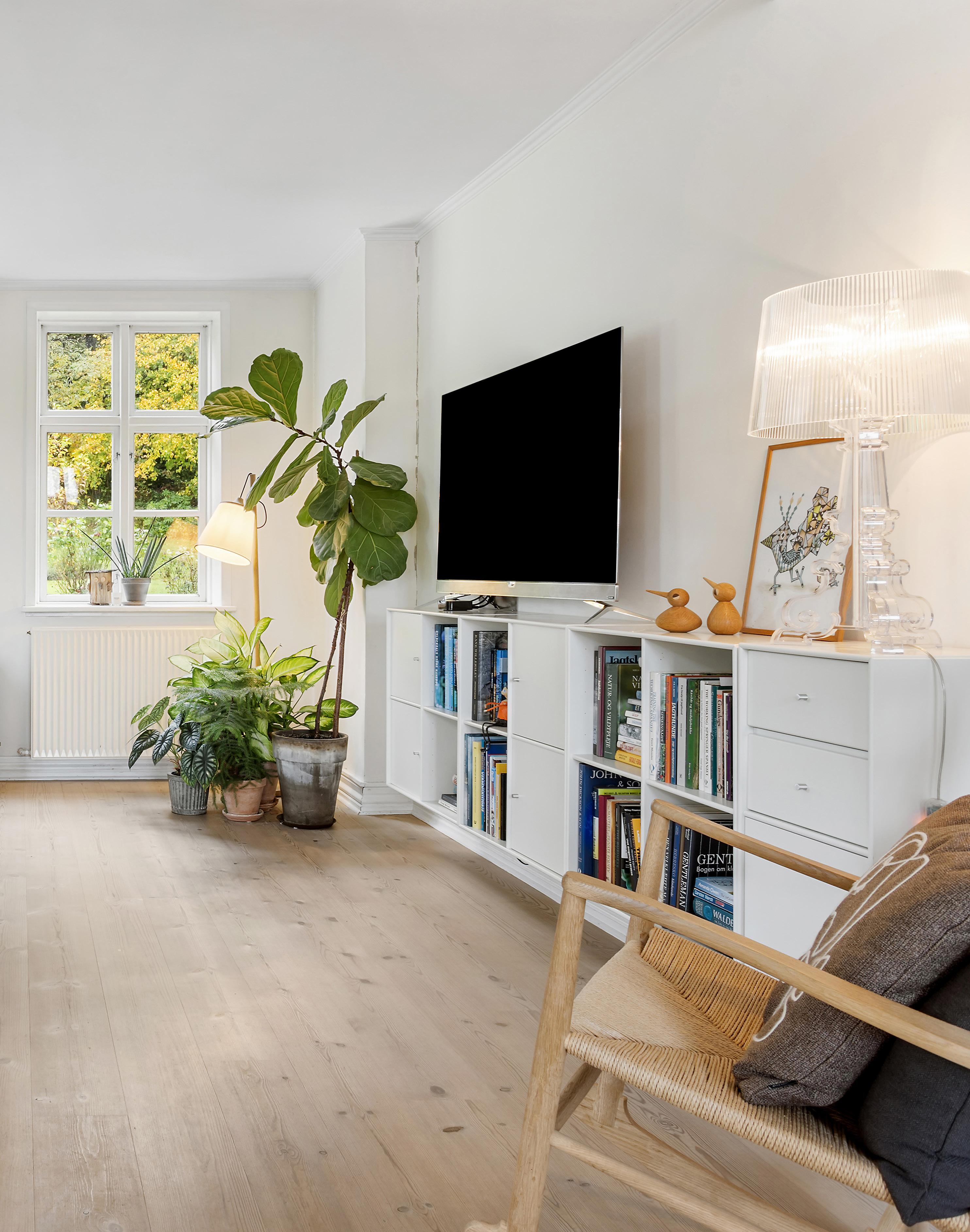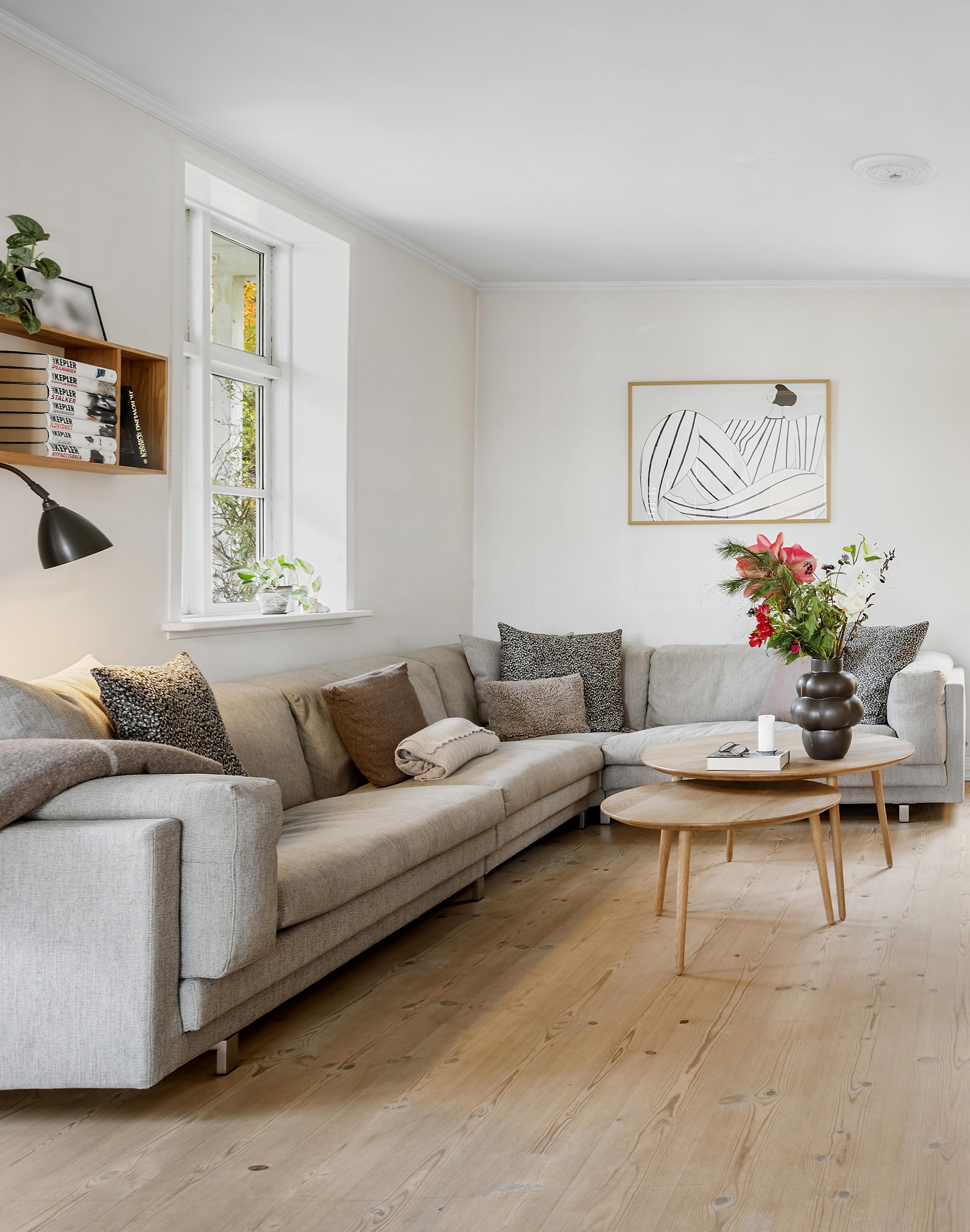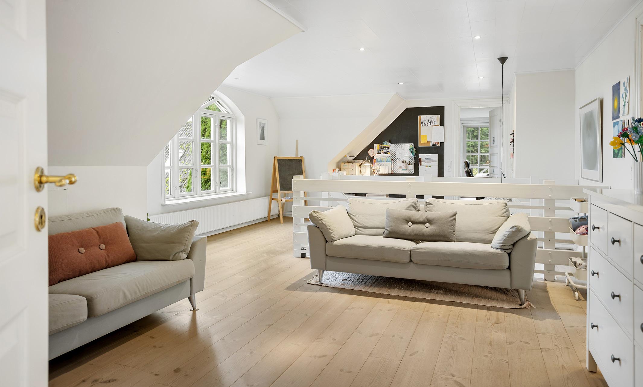 Boligen rummer flere opholdsarealer, som hver især har deres egen stemning. I stueplan ligger den hyggelige opholdsstue som naturligt midtpunkt, og herfra er der udgang til den overdækkede træterrasse og haven, så man let kan lade døren stå åben på gode dage og lade naturen trække ind. Rummet er lyst, venligt og præget af de flotte trægulve, som går igen i husets øvrige opholdsrum. På førstesalen findes en usædvanligt stor repos, der ikke bare er en fordelingsgang, men et reelt opholdsareal med plads til sofa, skriveplads eller et stille hjørne til læsning. Det gør etagen fleksibel og særlig velegnet til familieliv, fordi man kan trække sig op, uden at være helt væk fra resten af huset, og samtidig har man udsyn til de omkringliggende marker og træer.