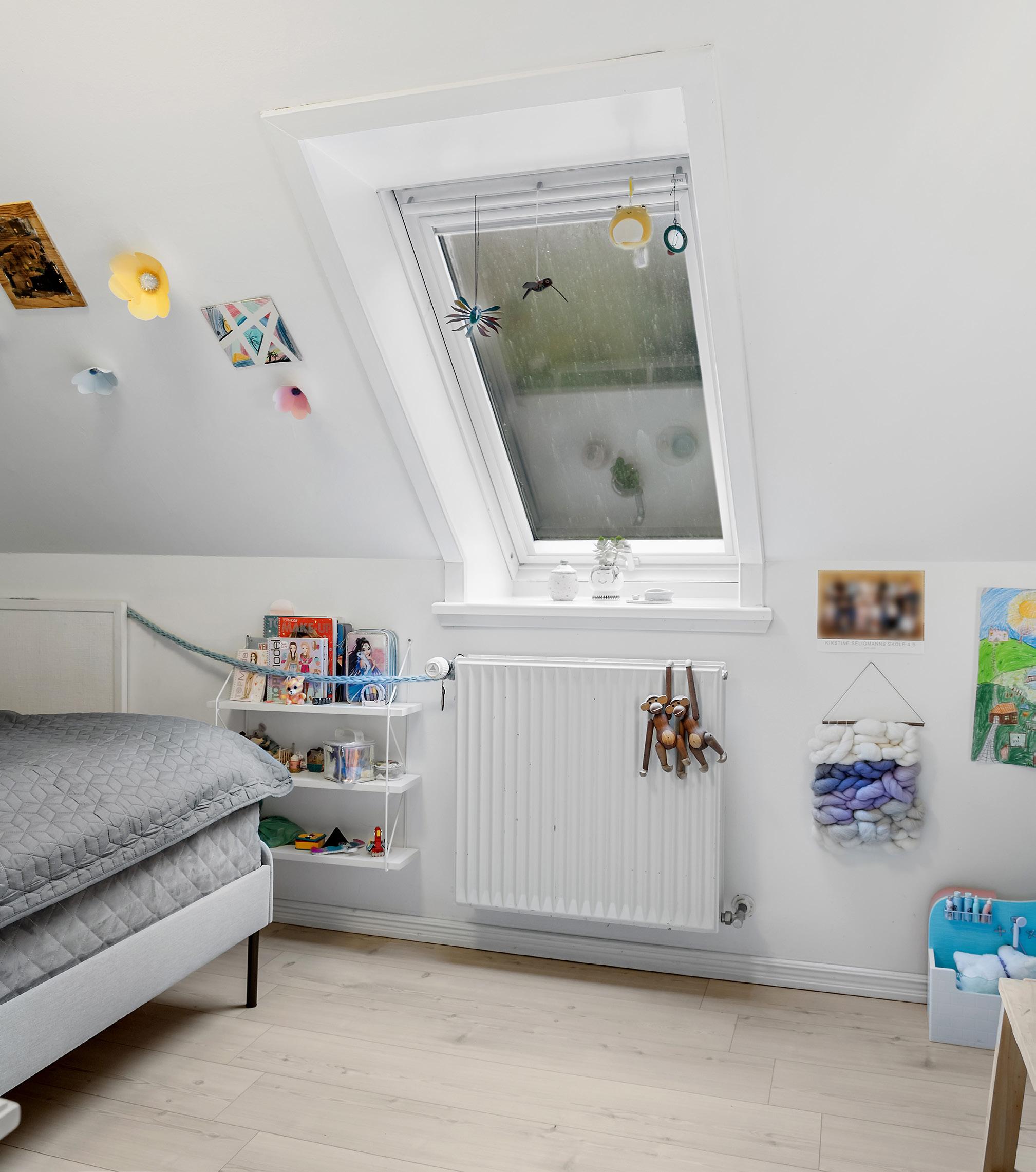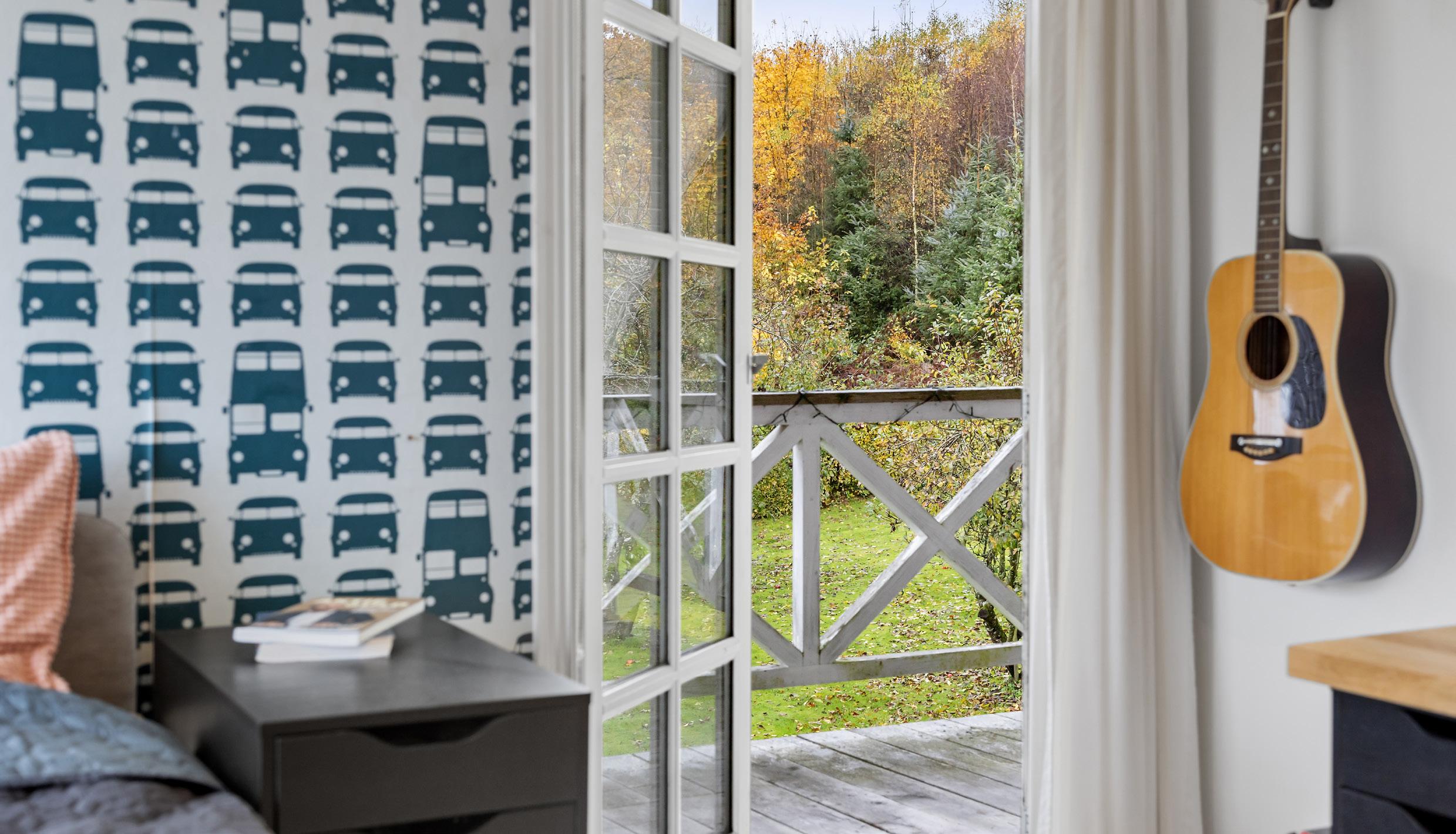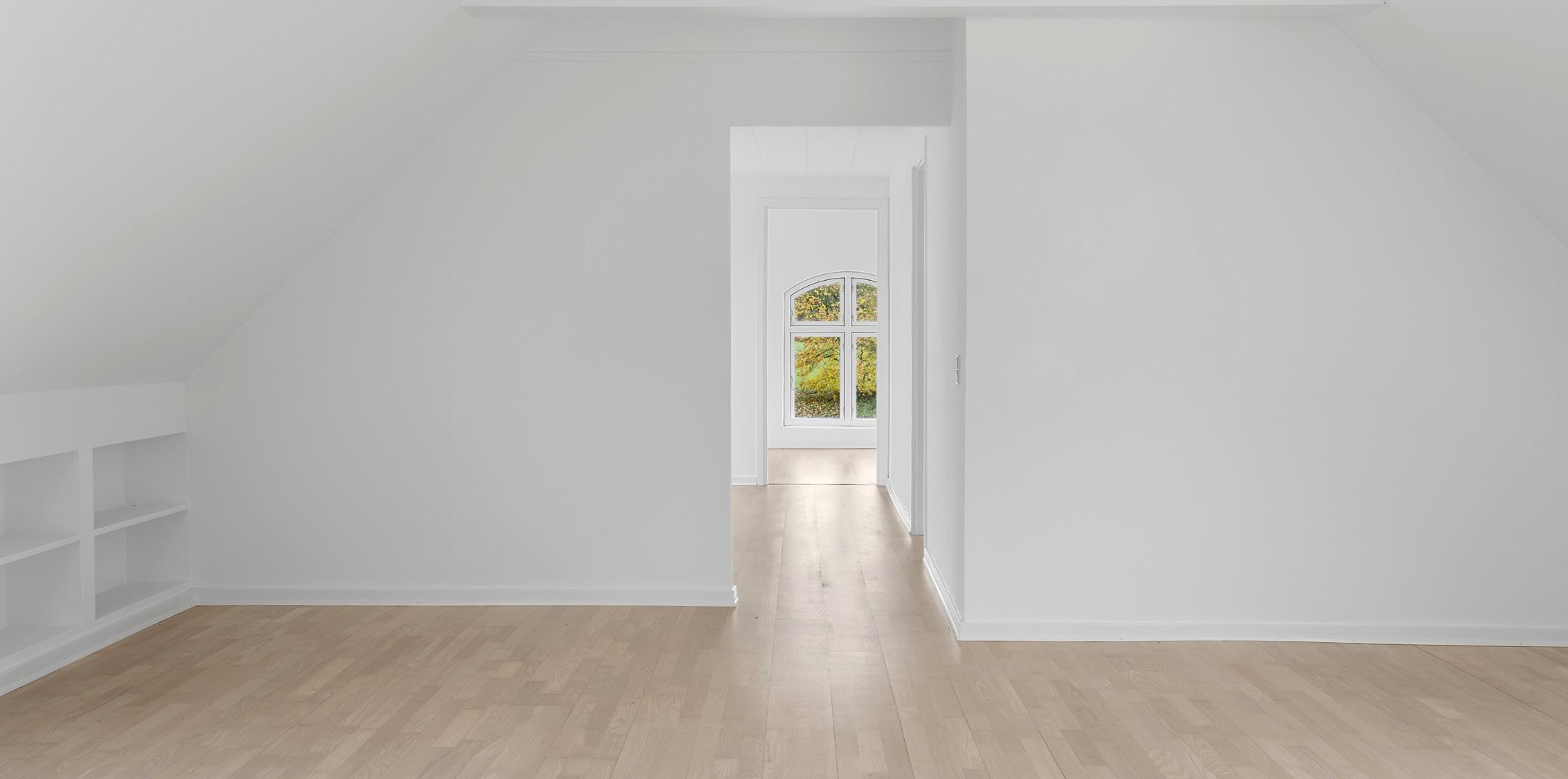 Førstesalen rummer foruden mastersuiten yderligere tre værelser, alle med en god størrelse og et ensartet udtryk med lyse vægge og brede trægulve. To af værelserne ligger i gavlen og har udgang til en stor altan, hvorfra man kan se ud over landskabet og følge lyset, når det bevæger sig hen over markerne i løbet af dagen. Det tredje værelse vender mod haven og får et blødt, grønt lys ind gennem vinduerne, der indrammer naturen som et levende bagtæppe. Den store repos binder rummene sammen og giver et luftigt flow gennem etagen, mens det andet badeværelse på denne etage er praktisk placeret i nærheden af værelserne. Her er lyse fliser og bruseniche – en funktionel løsning, som passer både til børn og gæster.