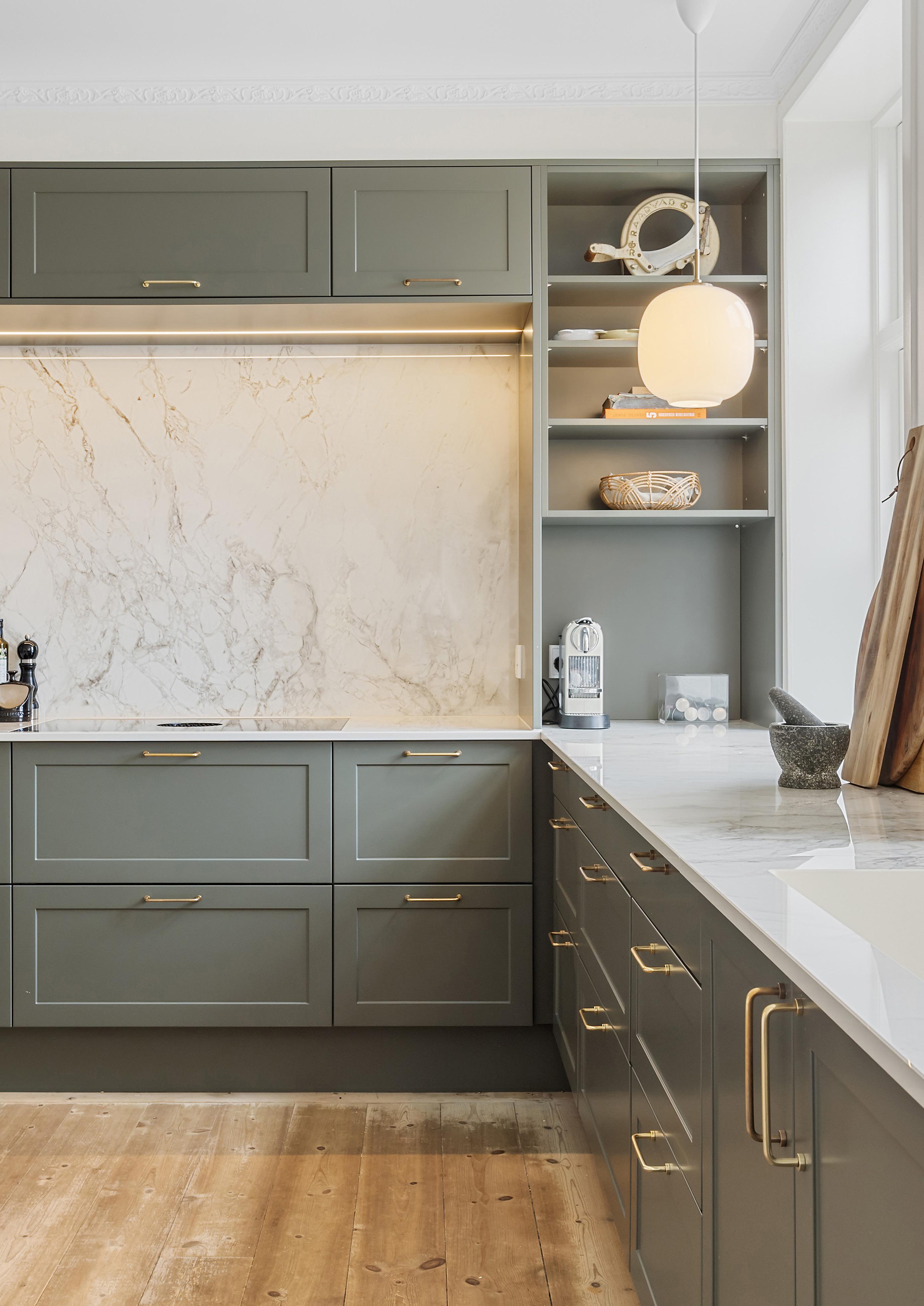 Køkkenet udgør husets naturlige samlingspunkt, et rummeligt og veldisponeret rum, hvor æstetik og funktion smelter sammen. De mørkegrønne skabe står i smuk kontrast til de lyse vægge og messingdetaljerne, samt egetræsskufferne, der fanger lyset og giver et strejf af varme. Dekton-bordpladerne i sten er robuste, elegante og enkle, og der er tænkt i alt udstyr til den krævende hverdag – her er dobbeltovn, kogeplade med integreret sug og quooker i messing. Fra køkkenet er der udsigt til den grusbelagte gårdsplads, og gennem to dobbelte franske døre ligger spisestuen – et virkelig stort og præsentabelt rum med udsigt til haven og naturen, hvor man kan sidde længe og lade blikket glide ud over landskabet, mens man nyder et godt glas vin fra vinskabene.