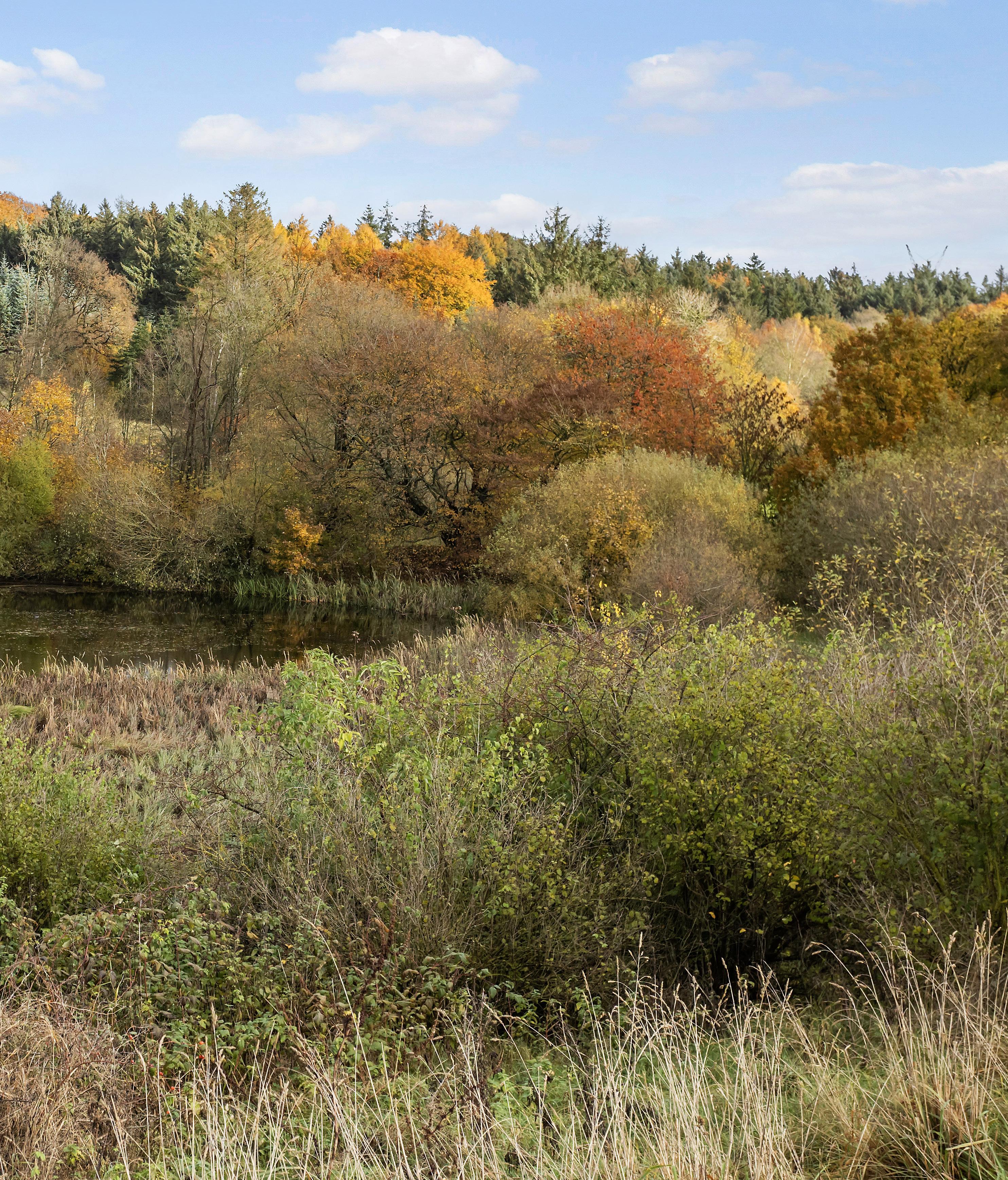 Den omkringliggende grund er en oplevelse i sig selv. Bag haven rejser skoven sig som et levende lærred, og foran er engen og søen, hvor spejlinger af himlen danner et roligt motiv. Den nuværende ejer har endda anlagt en lille naturlegeplads i skoven – et sted, hvor børn og voksne kan lade sig opsluge af naturens enkelthed. Her kan man gå på jagt på egen jord, følge dyrenes spor i dugvådt græs og opleve stilheden som noget aktivt, nærmest håndgribeligt.