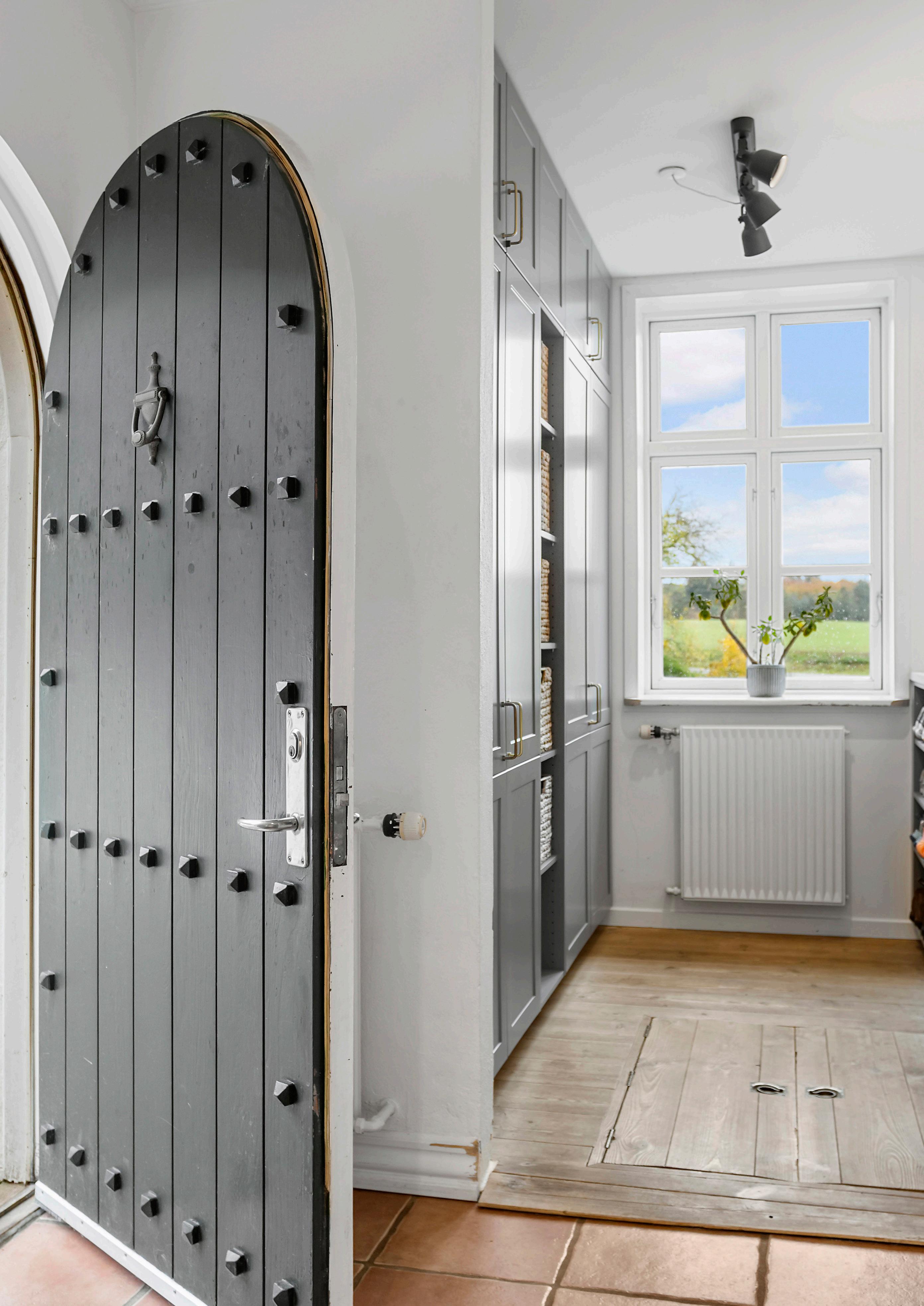 Når man træder ind i huset, mødes man af en fornemmelse af ro og proportion. Den store hall byder velkommen med sine praktiske klinker og den smukke trappe, der elegant fører op til førstesalen. Herfra fordeler dørene sig til husets øvrige rum, og allerede i entréen fornemmer man den særlige balance mellem det herskabelige udtryk og den meget brugbare indretning, som præger hele boligen. De klassiske døre og den fine stuk binder det hele sammen, mens lyset strømmer ind gennem vinduerne og lægger sig blødt over trægulvene. Udadtil markerer den mørke hoveddør sig mod gårdspladsen, mens den indvendigt fremstår lys og diskret. Fra hall’en er der indgang til stue, køkken, gæstetoilet og spisestue. Fra den praktiske bagindgang træder du ind i bryggerset, hvor der er god plads til både sko og overtøj – en naturlig indgang efter en tur i skoven eller på engen.