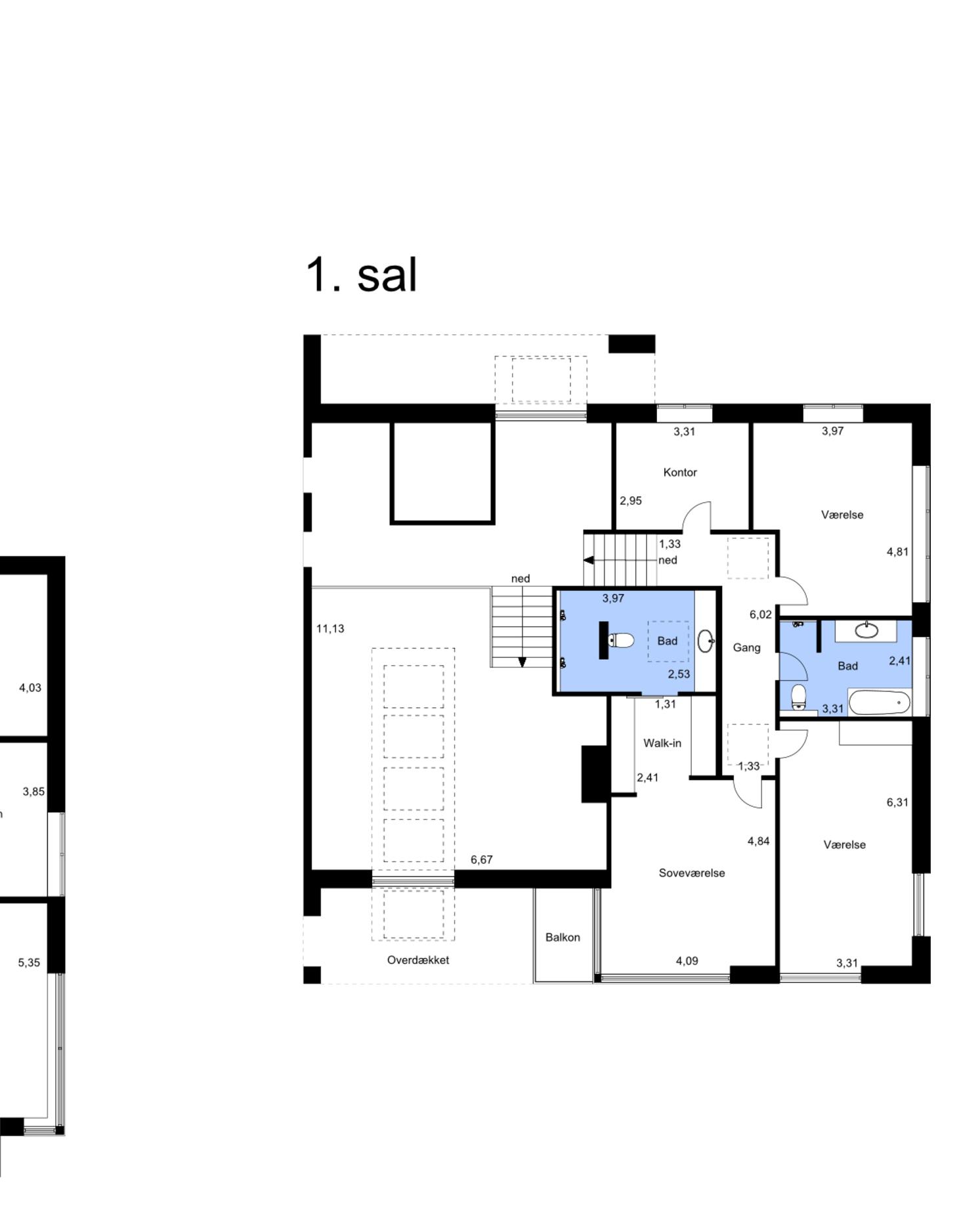 Mastersuiten er ligeledes placeret på samme niveau, mens et ekstra badeværelse er placeret diskret ved trappen, hvilket sikrer nem adgang for både beboere og gæster uden at kompromittere privatheden i soveafsnittet.