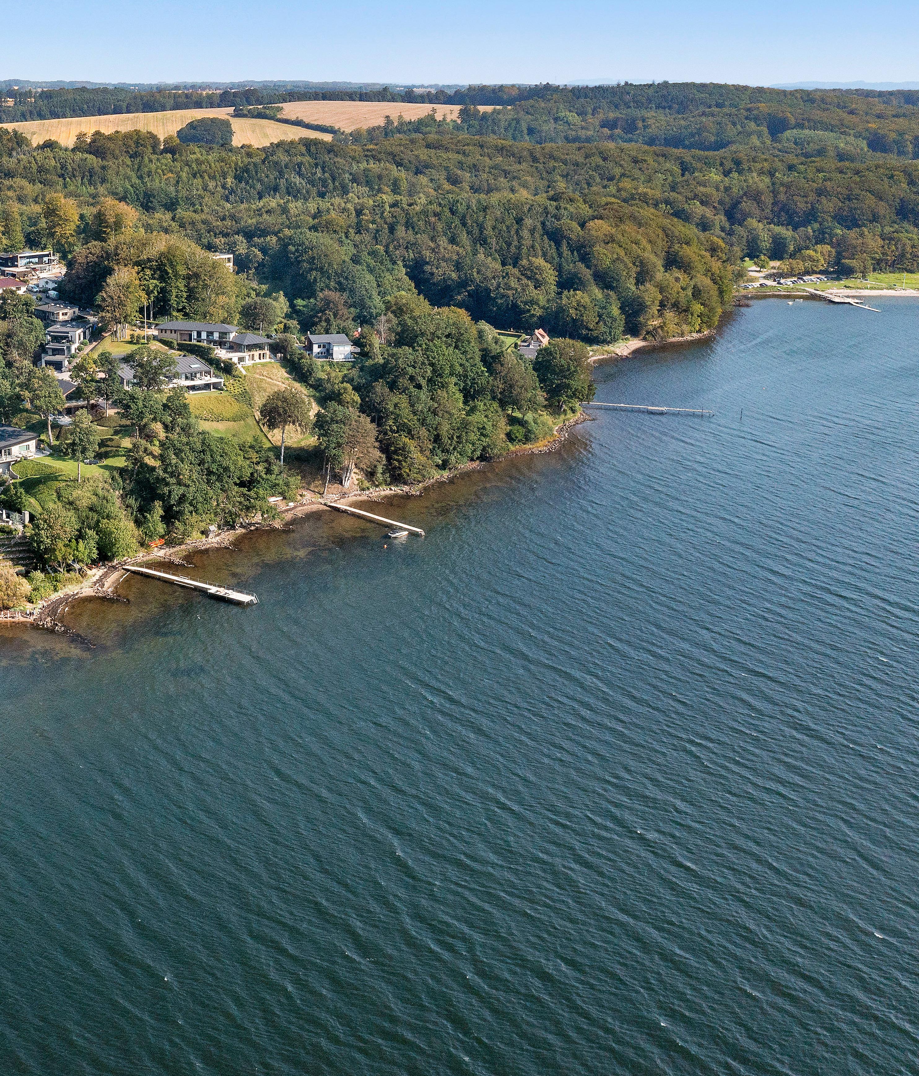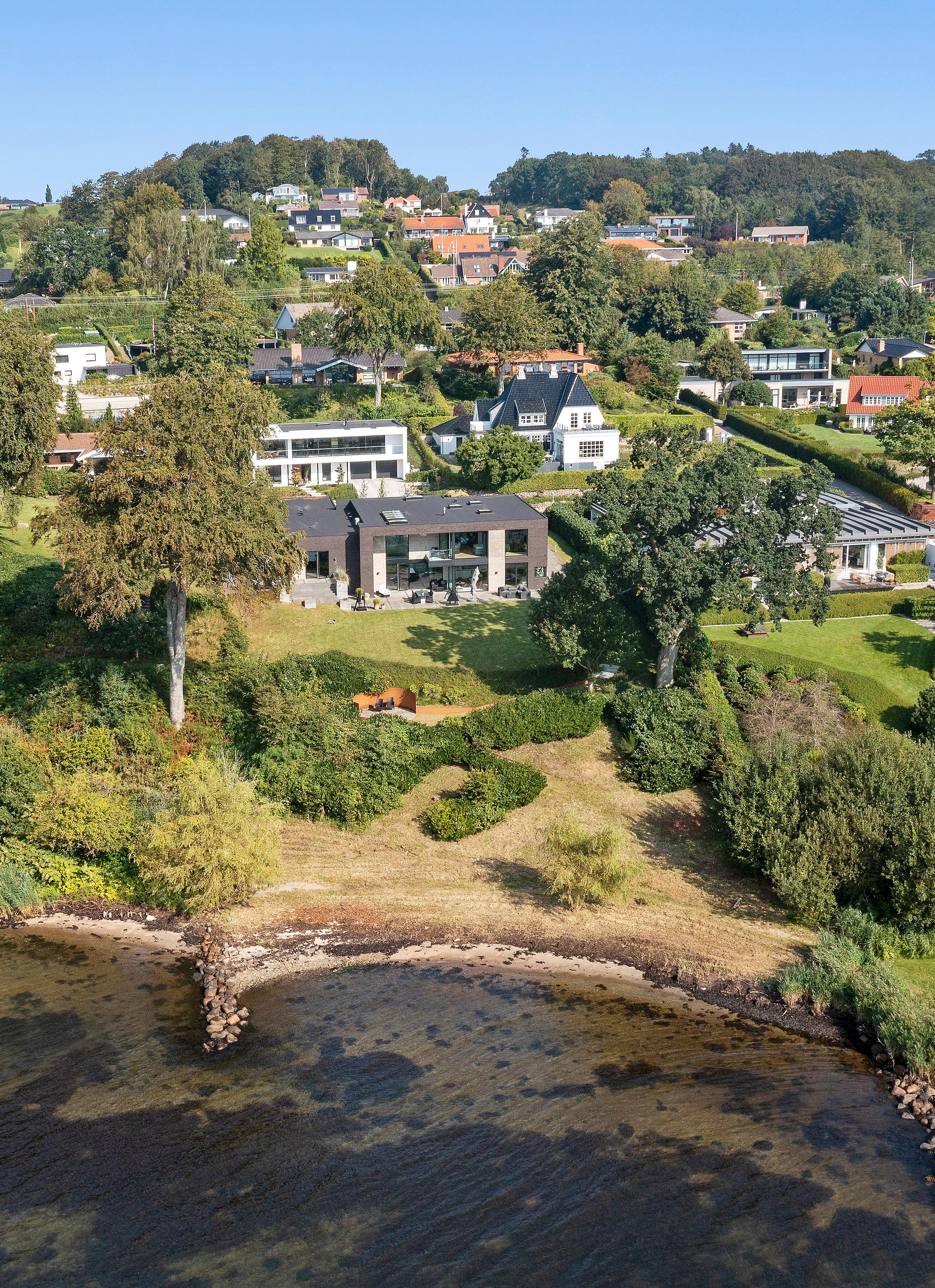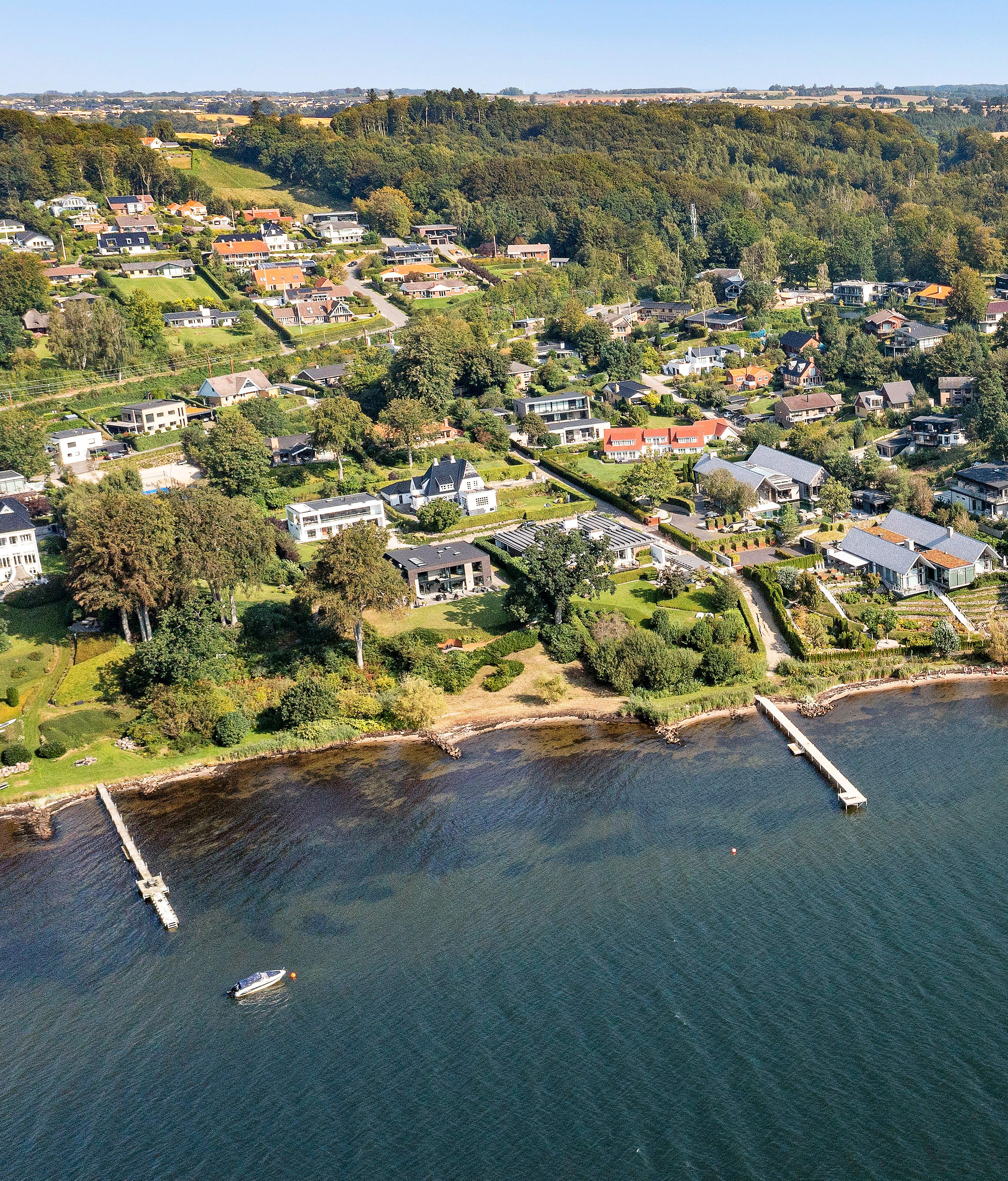 Denberømte arkitekt Le Corbusier mente, at form, funktion og lys skal spille sammen i perfektion for at opnå en harmonisk arkitektur. Og netop dette går op i en højere enhed i denne enestående villa. For enden af en stille og privat vej i Bredballe, hævet højt i første række til Vejle Fjord, ligger Rosenvænget 14, hvor udsigten over fjorden er i centrum og forenes til fulde med formgivning og naturligt lys. Villaen er designet med store vinduespartier og åbne rum, der skaber en flydende overgang mellem inde og ude. Lyset strømmer gennem rummene og fremhæver de naturlige materialer, mens fjordens skiftende farver og landskab konstant indrammer hjemmet, og giver en følelse af, at naturen er med dig hver gang du kigger ud.