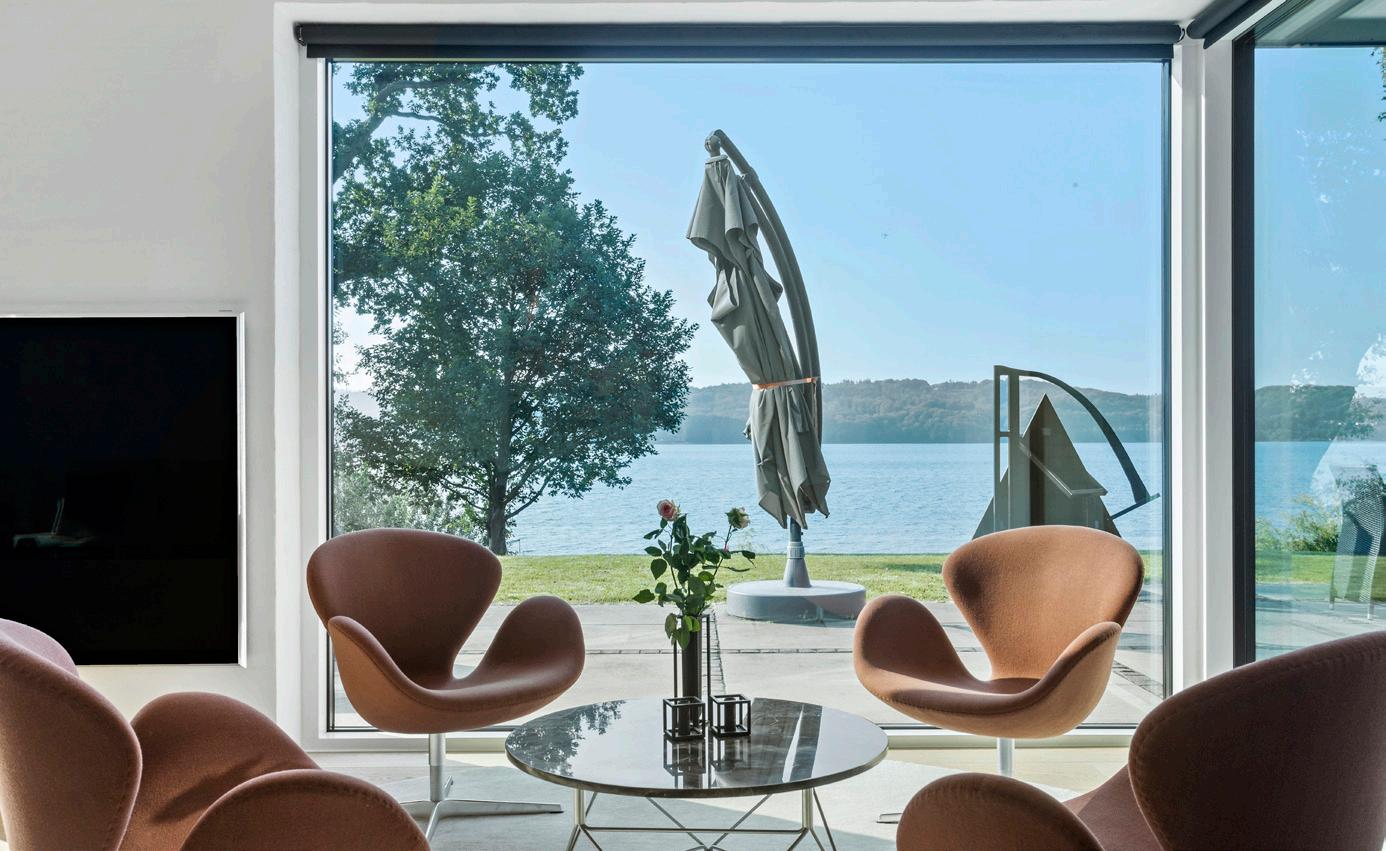Hver afdeling af huset åbner sig mod landskabet – fra den store hall til de rummelige opholdsrum, hvor store glaspartier fylder rummet med naturligt lys og giver en følelse af åbenhed og luksus. De mange kvadratmeter, den gennemgående høje kvalitet og de store, luftige rum skaber en atmosfære af eksklusivitet og komfort. Villaen er fuldmuret og opført med de fineste materialer, hvilket understøtter både husets funktionalitet og det tidløse design. Fra stueetagen og op til de øvrige etager, giver store vinduespartier et uafbrudt udsyn, hvilket skaber en følelse af at være i ét med naturen. Terrasseområderne og haven giver flere muligheder for at nyde de smukke omgivelser og den betagende udsigt, som ændrer sig hele året rundt.