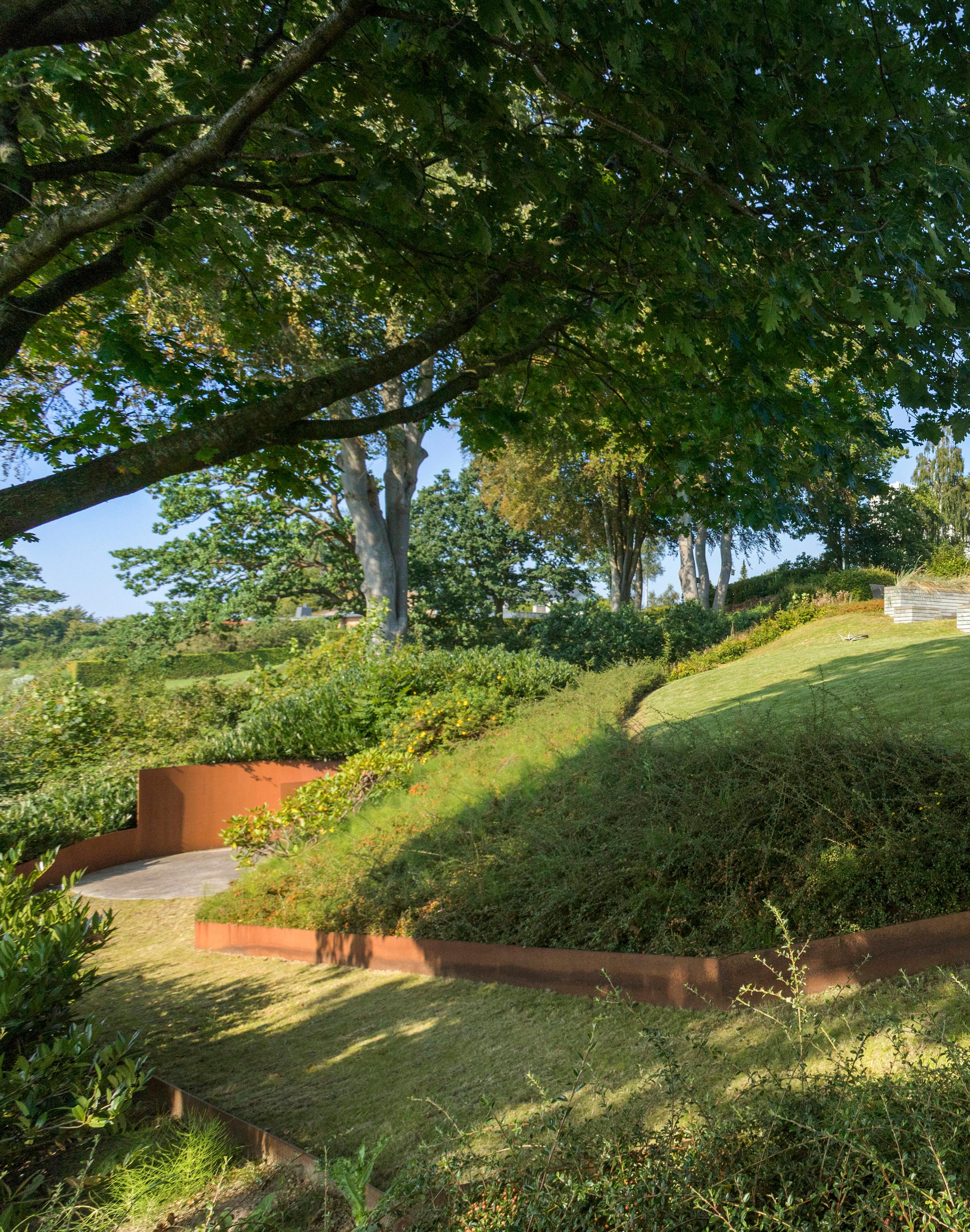 En betonterrasse længere nede i haven omgivet af lægivende buske og cortenstål er et ideelt sted at finde ro og fred.