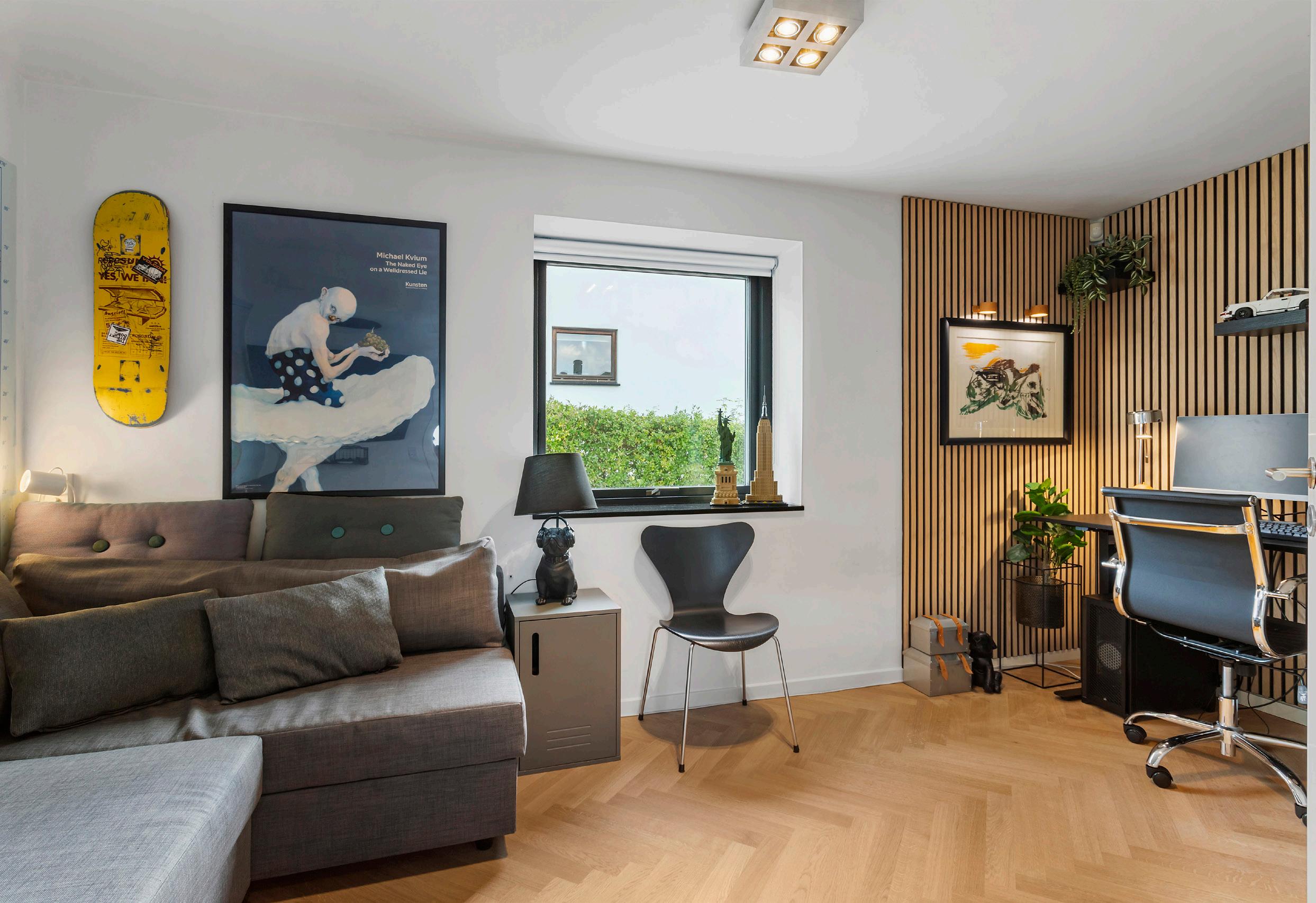 Foruden master bedroom rummer villaen flere gode værelser, der giver fleksibilitet til både familie- og gæsteliv. Allerede ved entréen ligger et lyst værelse med stort vindue, der i dag bruges som kombineret kontor og tv-stue, men som fint kan indrettes som børneværelse eller gæsteværelse. Den centrale placering tæt ved stuen gør det let at inddrage i dagligdagen, samtidig med at akustikpaneler tilfører en varm og behagelig stemning. I stueplan ligger et tilsvarende stort værelse side om side med master bedroom. Her er der ligeledes havudsigt og direkte udgang til den overdækkede terrasse og haven, hvilket gør rummet ideelt som teenageafdeling, børneværelse eller ekstra stue. Til højre i entréen finder du et smukt gæstebadeværelse med stor bruseniche, vaskeskab og spejl med indbygget lys. Her kan du åbne det matterede vindue og nyde udsigten direkte ned igennem Fænøsund, imens du står og børster tænder.