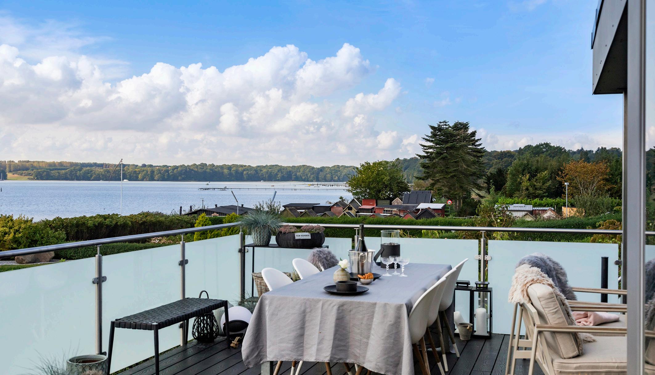Fra stuen åbner en stor, delvist overdækket altan sig, og herfra føles det næsten, som om du sejler gennem Fænøsund, når du står forrest ude i spidsen og kigger ud over vandet.