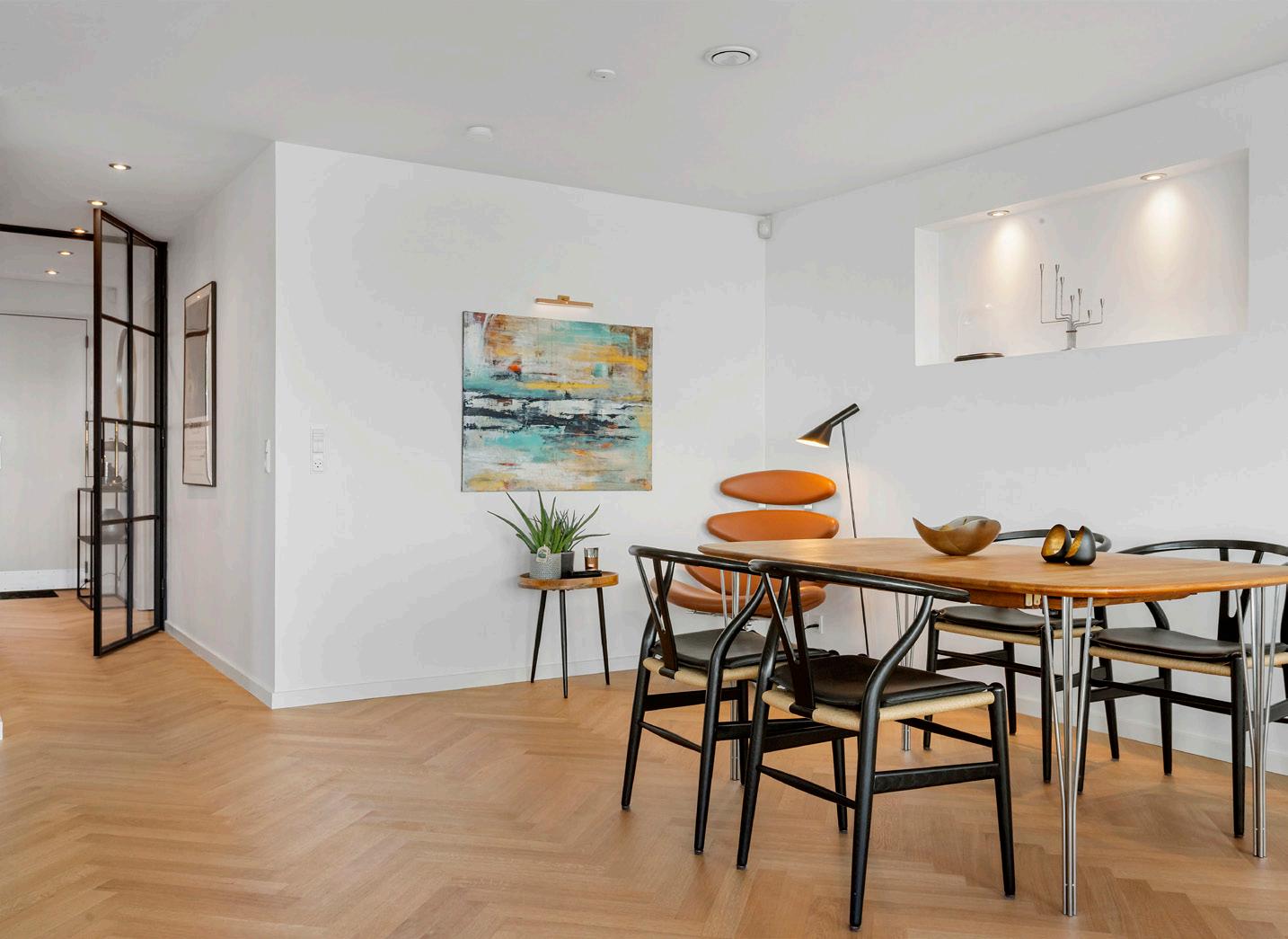 Indenfor fortsætter oplevelsen i et hjem, der er skabt til både udsigten og hverdagen. Den energivenlige villa er opført i 2013 og fremstår moderne og velholdt, indflytningsklar med neutrale og naturlige farvevalg, som de fleste kan se sig selv i – og samtidig med plads til at sætte dit eget præg, hvis du ønsker det. Der er en varm og indbydende atmosfære, hvor sildebensparket i eg løber gennem alle rummene og skaber et sammenhængende udtryk. Flere steder tilfører akustikpaneler i varmt træ en rolig klang til rummene, mens lyse flader og sorte vinduesrammer skaber kontrast og fremhæver udsigten som levende kunstværker på væggene. Samspillet mellem materialerne giver en følelse af kvalitet og rummelighed, hvor detaljerne er gennemtænkte uden at stjæle opmærksomheden fra udsigten og naturen udenfor.