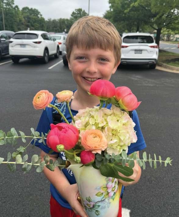 Behind the scenes, this business is very much a family project. As a single mom and full-time teacher, Lisa has woven her creative work into the daily life of her household. For the entire rst year, her “design studio” was her younger son’s air hockey table in their sunroom, layered with buckets, clippers, and blooms instead of paddles and pucks. Her two boys, Brady and Ian, now in 7th and 5th grade, have grown up among the owers, riding along on deliveries, stepping in as impromptu photographers, and serving as her built-in cheer squad.