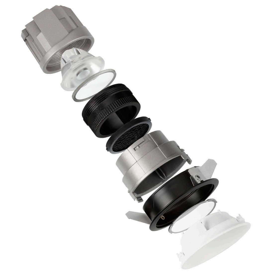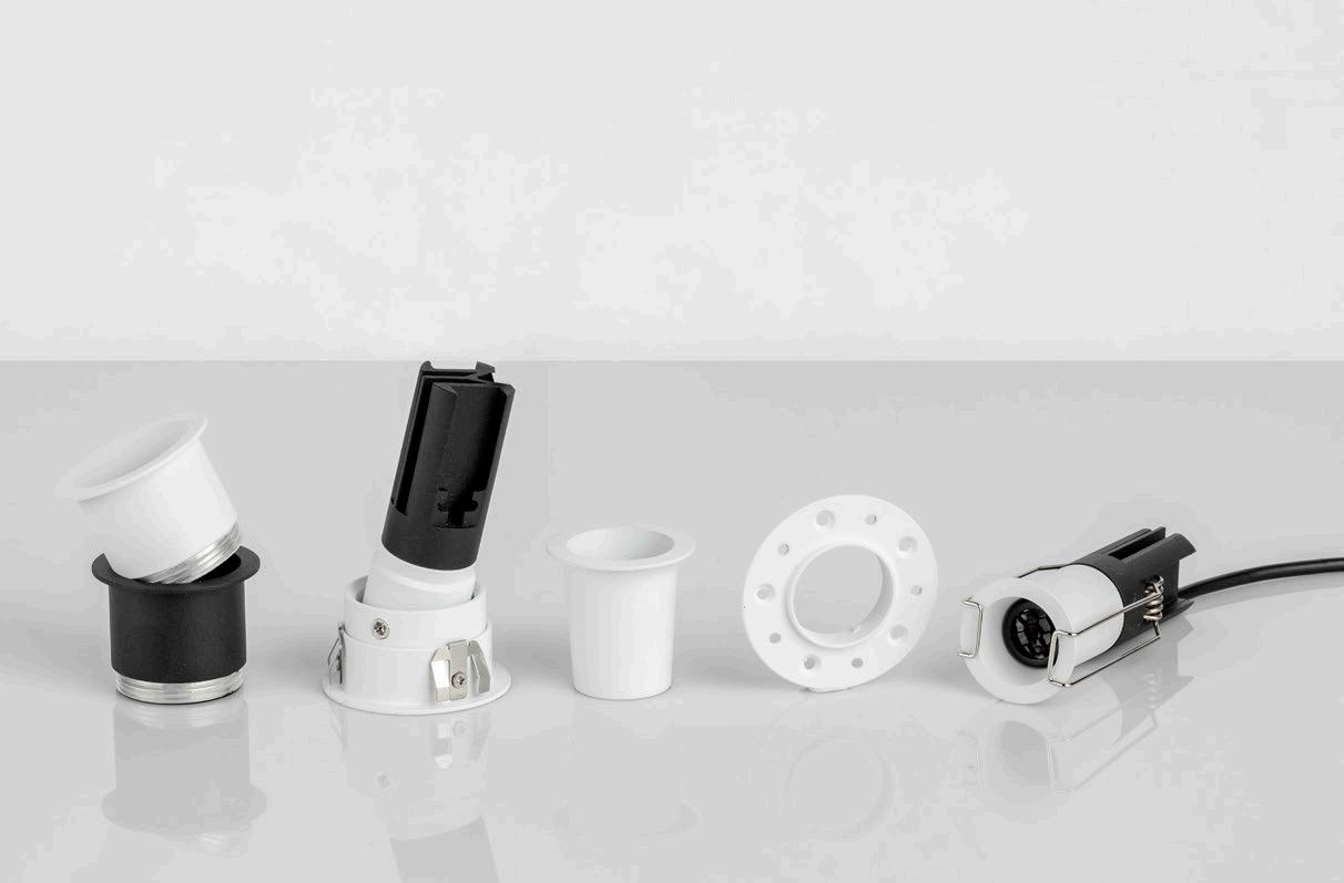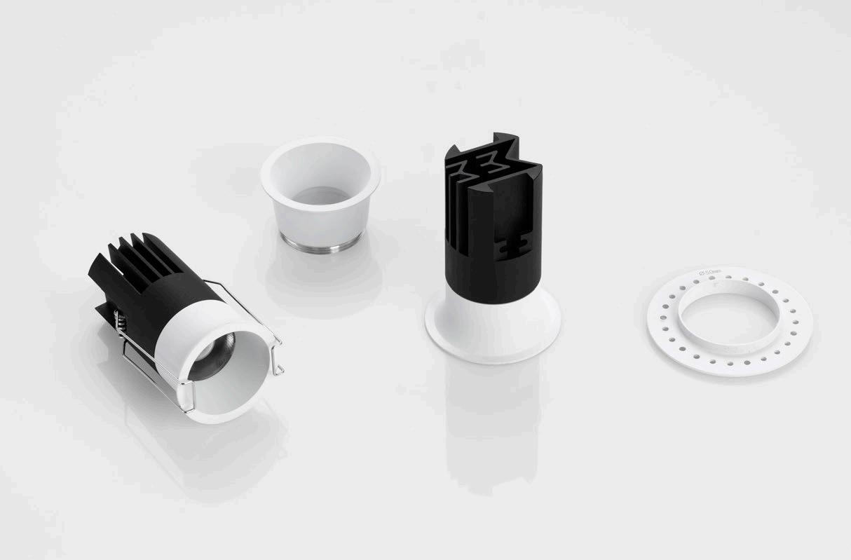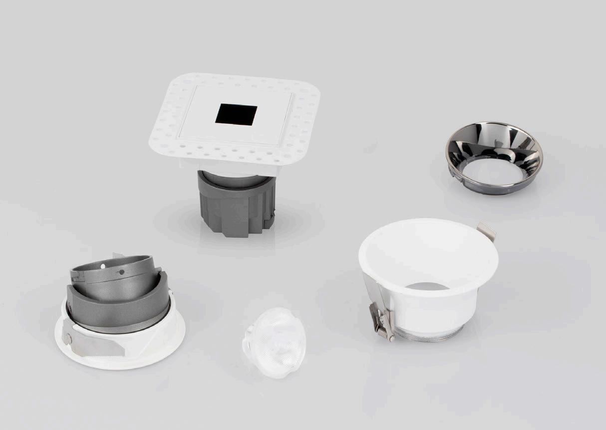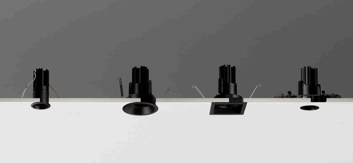 ONE DOWNLIGHT - INFINITE APPLICATIONS Introducing our next-generation modular downlight series, engineered and assembled in-house to deliver unparalleled flexibility, performance, and design precision. Available in two distinct versions — the "One" and the compact " MiniOne" — this system redefines architectural lighting with high efficiency outputs of up to 130 lm/W in the final product. Designed for versatility, it offers a broad range of trim color combinations, multiple Cut-Out sizes (from 25mm to 75mm), and both adjustable and fixed configurations to suit diverse installation needs. With IP54 protection options, UGR<17 and Darklight technology for the standard version, and innovative with special lens versions, this modular solution brings performance and aesthetics together seamlessly — making it the ideal choice for refined, modern interiors.