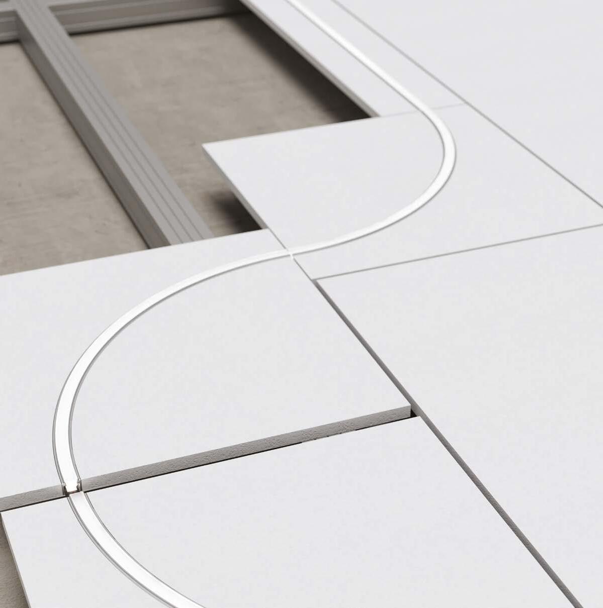 Linear and curved LED modules, designed to be mounted in continuity and draw countless shapes of lines of light. The modules available are: sheets with an aluminum arched profile with a width of 90° and 45° for radii of 300 mm and 600 mm; square plate with a complete luminous circle of radius 300 mm; linear slab of length 996 mm or 1992 mm; 996 mm linear slab with pre-blanking for cutting on site. The LED modules follow the modularity of the aluminum profiles.