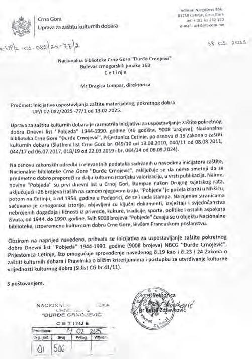 Uprava za zaštitu kulturnih dobara prihvatila inicijativu Nacionalne biblioteke „Đurđe Crnojević“ da se najstariji dnevni list valorizuje i zaštiti