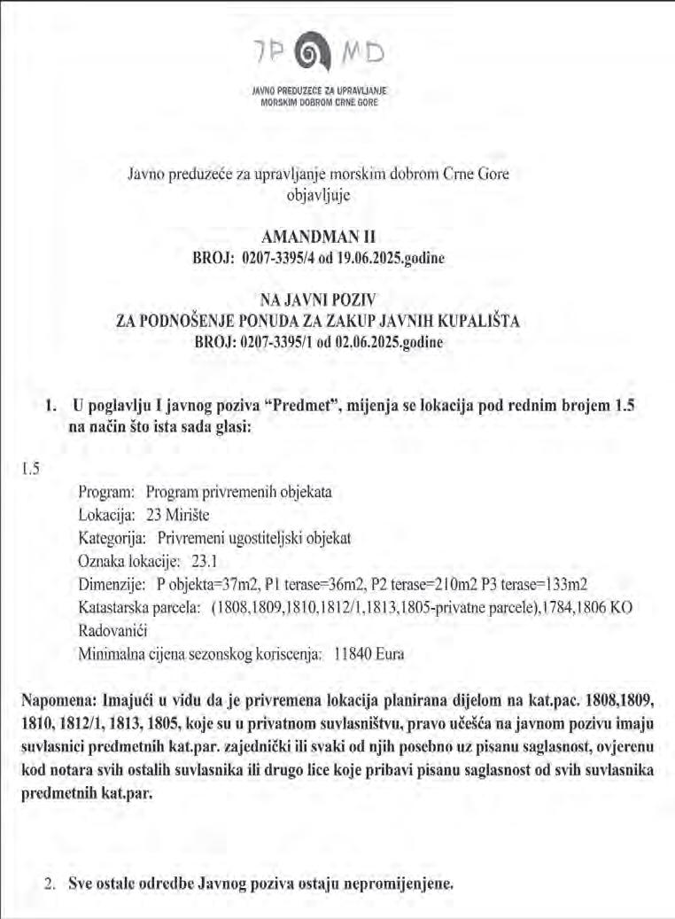 Skupština Društva će se održati dana 1.7.2025.godine (utorak), u Podgorici, u sjedištu Društva na adresi: Kralja Nikole br.4, Podgorica, Crna Gora, sa početkom u 12 časova. Za ponovnu vanrednu skupštinu utvrđen je sljedeći
