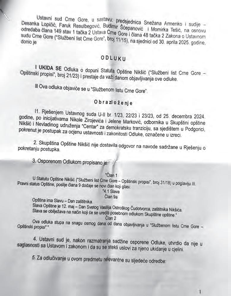 Ustavni sud odlučio da Nikšić ne može da ima krsnu slavu grada po inicijativi, ali samo zbog načela legaliteta
