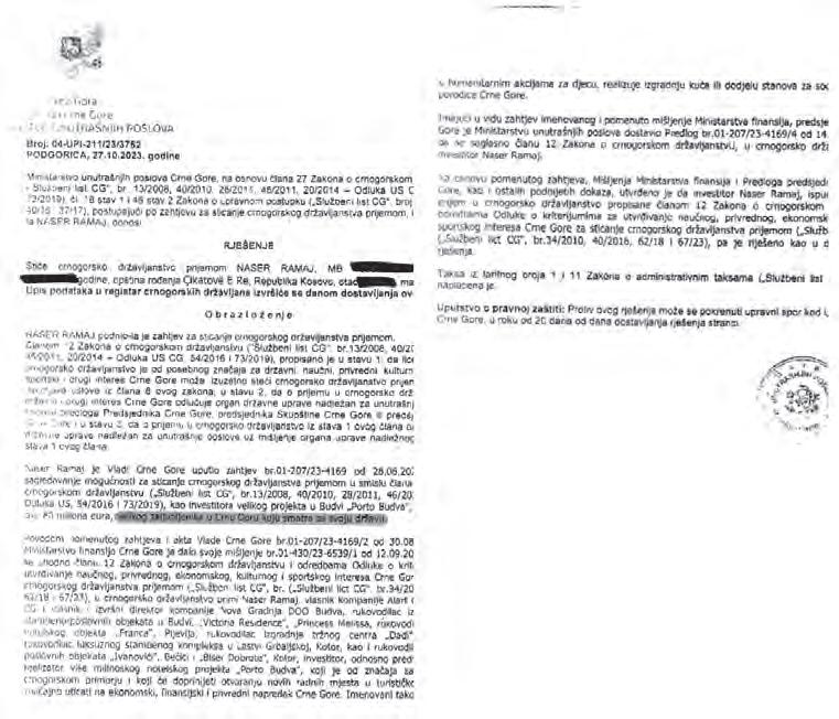 sno na osnovu čega je Ministarstvo finansija dalo pozitivno mišljenje da Ramaj bude primljen u crnogorsko državljanstvo.