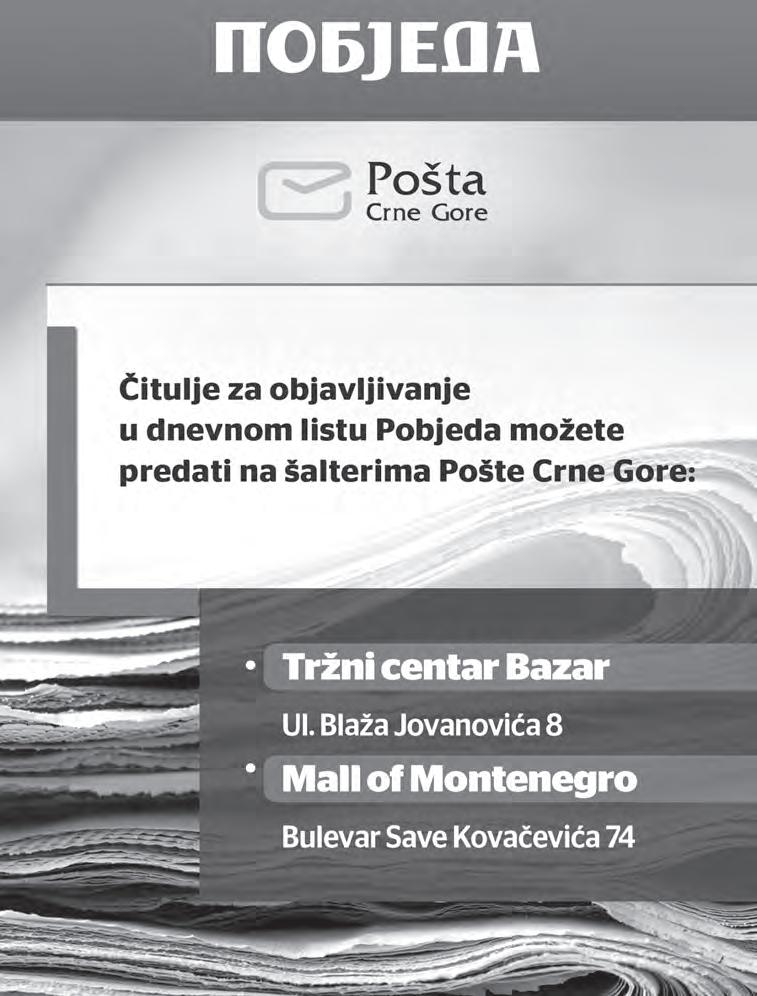 U slučaju objavljivanja simbola, broj riječi se umanjuje za 20. Prostor 1/36 ne može da sadrži simbol. tel: 020 202 455; viber: 068 034 555; e-mail: oglasno@pobjeda.me
