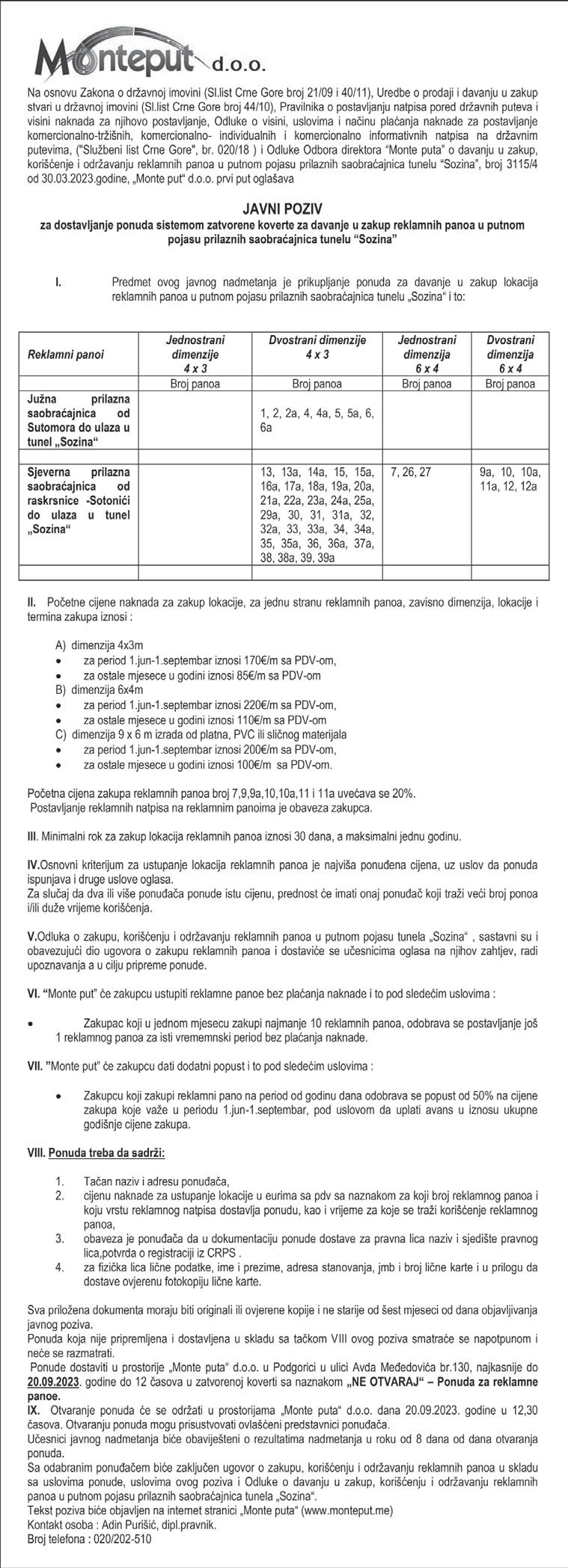 Početna cijena zakupa iznosi 300,00 eura/mjesečno. Zakupac, koji bude izabran po pozivu, je obavezan da pri potpisivanju ugovora, uplati iznos zakupnine za 3 mjeseca unaprijed. II