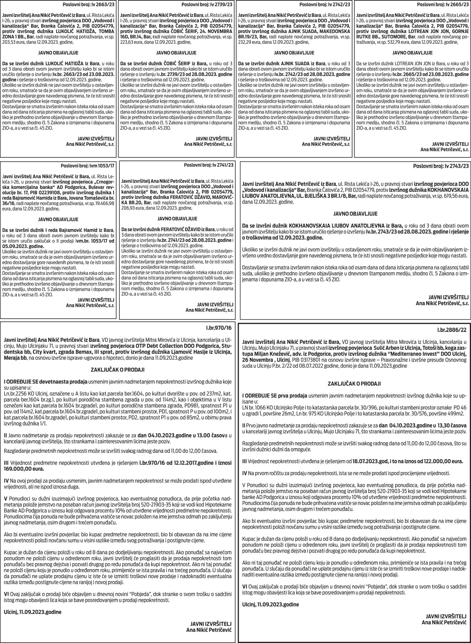 I.br.484/2014 Javni izvršitelj Dušan Nišavić, sa službenim sjedištem u Beranama, ul. M. Zečevića br 30, u pravnoj stvari izvršnog povjerioca “FOLDANA FINANCIAL” DOO Podgorica, sa sjedištem na adresi ul. Cetinjski put br. 11, Podgorica, protiv izvršnih dužnika Čilović Sejda i dr, radi naplate novčanog potraživanja 2.392,00€, shodno čl. 45 ZIO-a, dana 08.09.2023 godine, J A V N O O B J A V LJ U J E