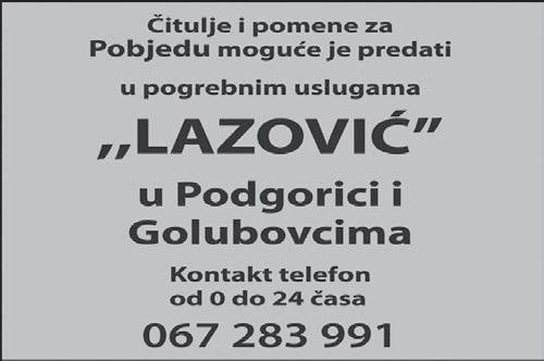 Саучешће примамо на градском гробљу Чепурци дана 15. марта од 10 до 16 часова и дана 16. марта од 9 до 11 часова када крећемо за село Старче-Горња Морача гдје ће се обавити сахрана у 15 часова. Ожалошћени: синови ДРАГОСЛАВ, РАДОВАН и РАДОСАВ, ћерке МИЛУША и МИЛА, браћа ВУКСАН и ЉУБОМИР, сестре ДУЊА, АНЂЕЛИЈА, БЛАГА и МИЛЕВА, снахе СЛАЂАНА, САЊА, МИЛЕНА и НЕДЕЉКА, заова МИЛИЦА, јетрва ЗОРКА, братанићи, братаничне, сестрићи, сестричне, ђеверичићи, унучад и остала многобројна родбина ЛУКОВАЦ и ЈОВАНОВИЋ