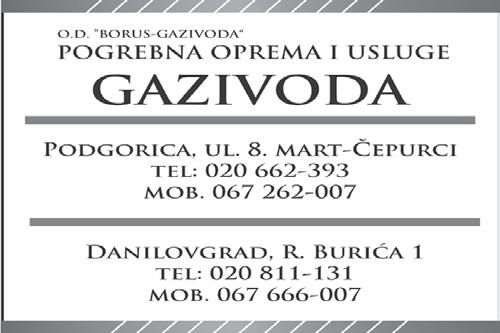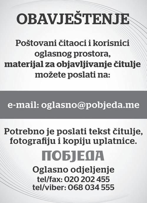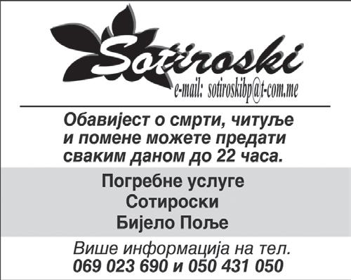 Saučešće primamo u kapeli Donja Gorica dana 20. marta od 10 do 15 časova i dana 21. marta od 10 do 13 časova, nakon čega će se obaviti sahrana na Novom groblju na Ćemovskom polju u 14 časova. Kuća žalosti – Raka Mugoše 24B