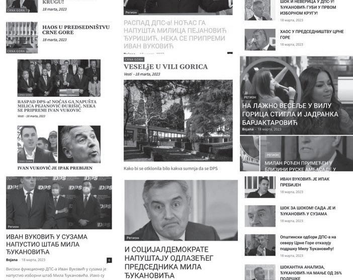 tabloidi uoči i tokom izbornog dana „bombardovali“ su lažnim vijestima koje su bile usmjerene na diskreditovanje DPS-a i predsjedničkog kandidata te partije Mila Đukanovića. Pisali su o prebijanju gradonačelnika Podgorice