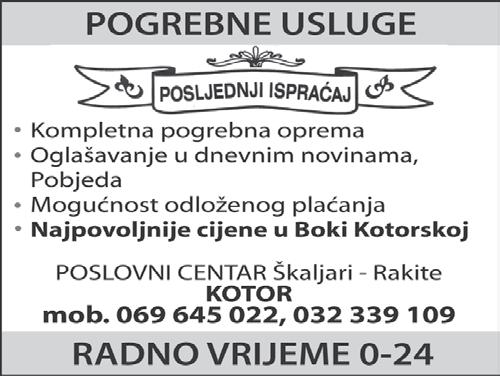 Saučešće primamo u gradskoj kapeli u Tivtu dana 19. marta od 15 do 18 sati i dana 20. marta od 10 do 15 sati kada pogrebna povorka kreće prema gradskom groblju Brdišta gdje će se obaviti sahrana.