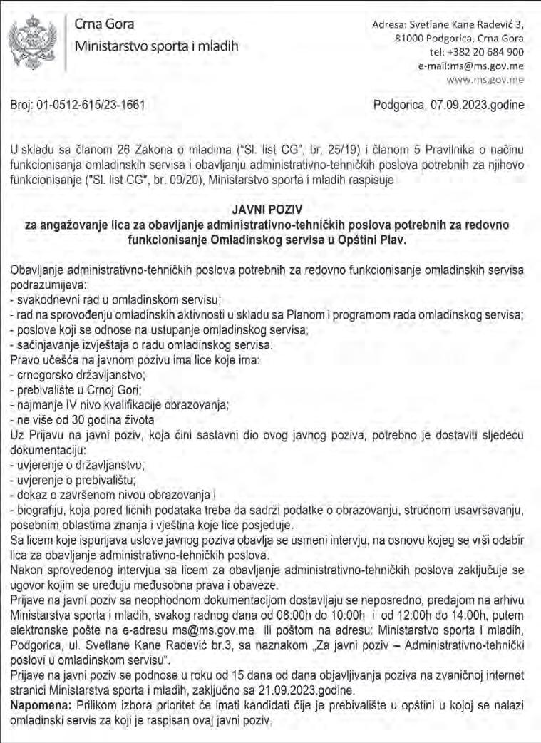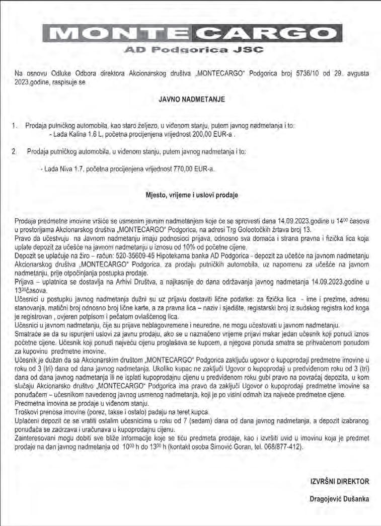 OGLASNO ODJELJENJE „NOVA POBJEDA“ TELEFON ZA INFORMACIJE 020/202-455, 020/202-456 e-mail:oglasno@pobjeda.me