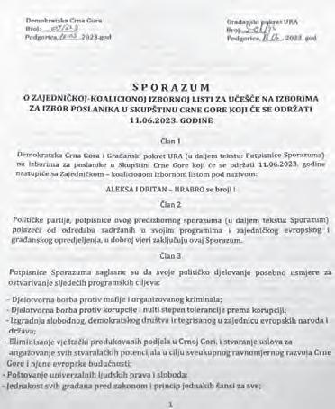 U članu 7 tog dokumenta piše da su se Demokrate i Ura sporazumom obavezale da će „jedinstveno pregovarati o formiranju vlasti nakon izbora 11. 6. 2023. godine“.