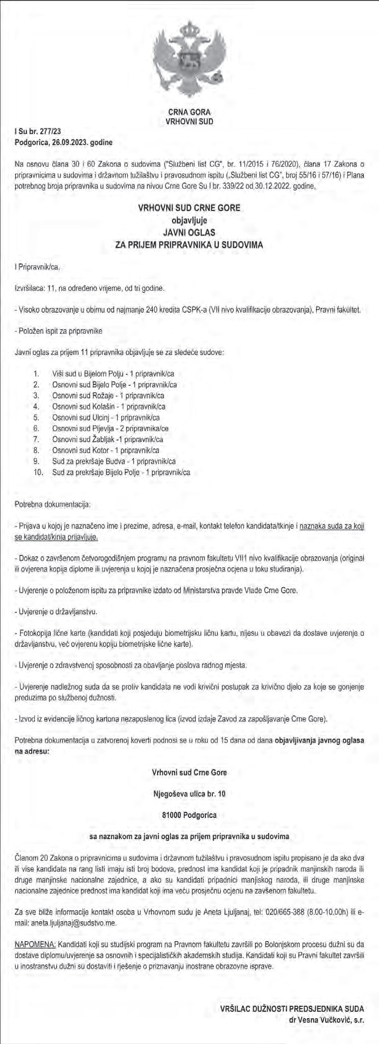 Nikšić, 26.09.2023. godine. JAVNI IZVRŠITELJ Maja Ajković