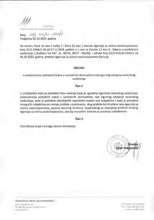 Bivši direktor Agencije za civilno vazduhoplovstvo Zoran Maksimović, prema saznanjima Pobjede, iako je penzionisan obavljao je dužnost, potpisivao odluke i razne dokumente. U ACG trenutno postoji pomoćnik direktora koji po Zakonu i internim aktima ACV u odsutnosti direktora vodi ovu instituciju i druga osoba koju je ovlastio razriješeni direktor zloupotrebom pečata i arhive