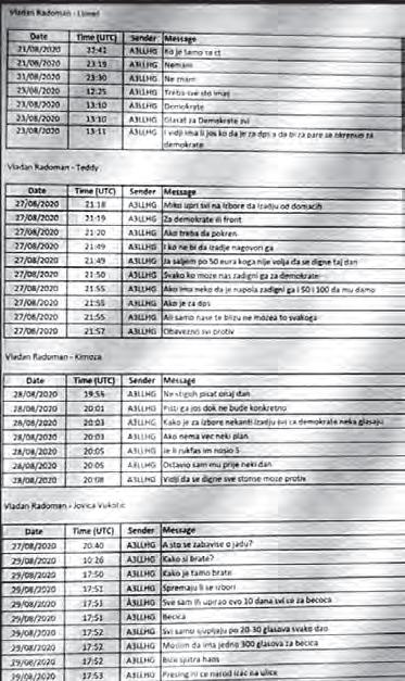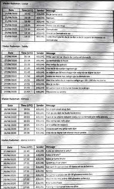 - Ali samo naše te blizu ne može svakoga – piše on, uz konstataciju: „Obavezno svi protiv“. Osobi pod nikom Kimoza, 28. avgusta 2020, u 20.03 sati, Vladan Radoman piše: „Kako je za izbore neka ti izađu svi za demokrate neka glasaju“ i nastavlja: „Ako nema već neki plan“. Dalje pita sagovornika „Je li rukfaš im nosio 5“ i dodaje: „Ostavio sam mu prije neki dan“.