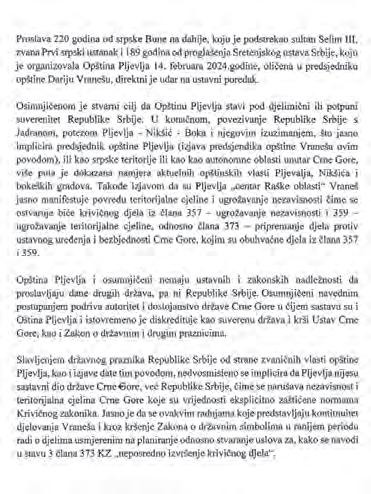 Podnosioci ove krivične prijave su ukazali na to da postoje nesporni dokazi da je Vraneš organizovanjem svečane akademije, u Centru za kulturu Pljevlja, u čast druge države - počinio krivično djelo iz člana 373 Krivičnog zakonika Crne Gore, a u vezi sa krivičnim djelima iz člana 357 i 359, koje se goni po službenoj dužnosti. - Proslava 220 godina od Bune na dahije, koju je podstrekao sultan Selim III, zvana Prvi srpski ustanak i 189 godina od proglašenja Sretenjskog ustava Srbije, koju je organizovala Opština Pljevlja 14. februara 2024. godine, oličena u predsjedniku opštine Dariju Vranešu, direktni je udar na ustavni poredak - podvukli su oni. Osim što je Vranešu cilj da teritoriju pljevaljske opštine izopšti iz suvereniteta države Crne Gore ,,ili kao srpske teritorije ili kao kao autonomne oblasti unutar Crne Gore“, podnosioci krivične pri-