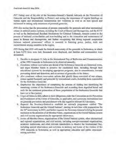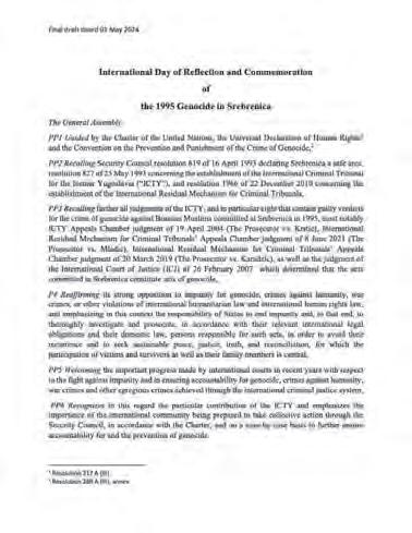 Nacrtu ovog dokumenta, odlučuje da li da se 11. jul proglasi međunarodnim danom sjećanja i komemoracije genocida u Srebrenici 1995, koji će se obilježavati svake godine. U stavu dva se kaže da se „bezrezervno osuđuje svako negiranje genocida u Srebrenici kao istorijskog događaja, te podstiču države članice da poštuju utvrđene činjenice, uključujući razvijanje odgovarajućih programa kroz svoje obrazovne sisteme, idući u pravcu sprečavanja negiranja i iskrivljava-