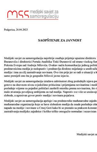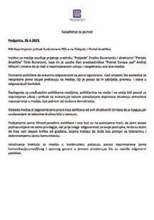 Institut za medije, Medijski savjet za samoregulaciju i NVO ,,35 mm“ osudili pritisak koji je funkcioner PES-a Andrej Milović pokušao da izvrši na Pobjedu i Portal Analitiku