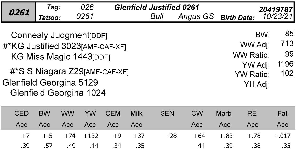 43 GLENFIELD JUSTIFIED 0261 20419787 ANGUS GS Birth Date: 10/23/21