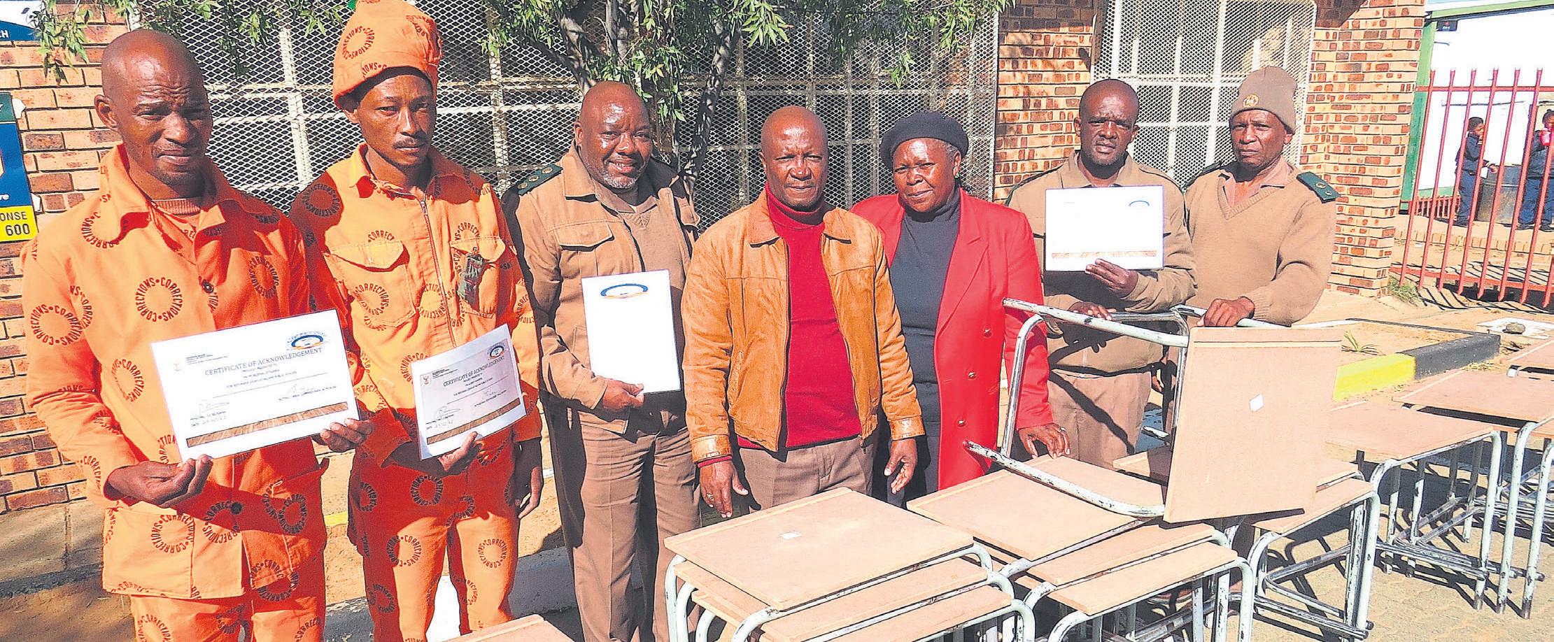 Sepheto Skosana, headmaster of Nzame, said the two inmates’ contribution was far-reaching in enabling learners to continue learning and also avoided 100 desks being wasted He presented a certificate of appreciation to each