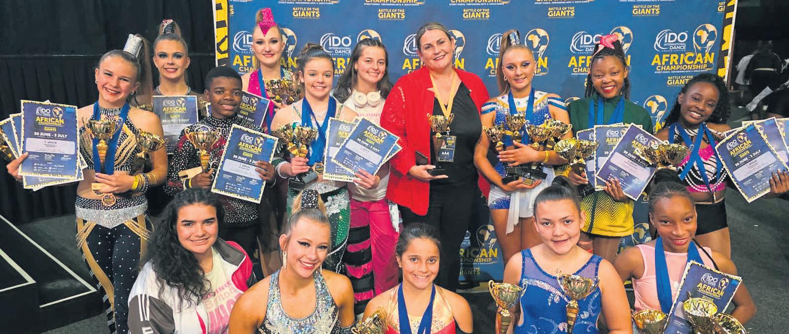 With their trophees as the IDO African Championships in Sun City are from the left,front: Sereena De Gouveia (17),Jaydene Barnard (17),Mariana De Almada (10),Denise Breytenbach (10) and Tholoana Mabope (14); back: Elné Mostert (13),Leané Swart (17),Sizolwethu Ngidi (12),Anzel Raath (17),Ewané de Bruyn (13), Feliciana De Almada (17),Senicia du Toit-Breytenbach (Dance Domination coach),Hayley van Wyk (15),Sedi Mosala (15) and Fundokuhle Molaba (15)